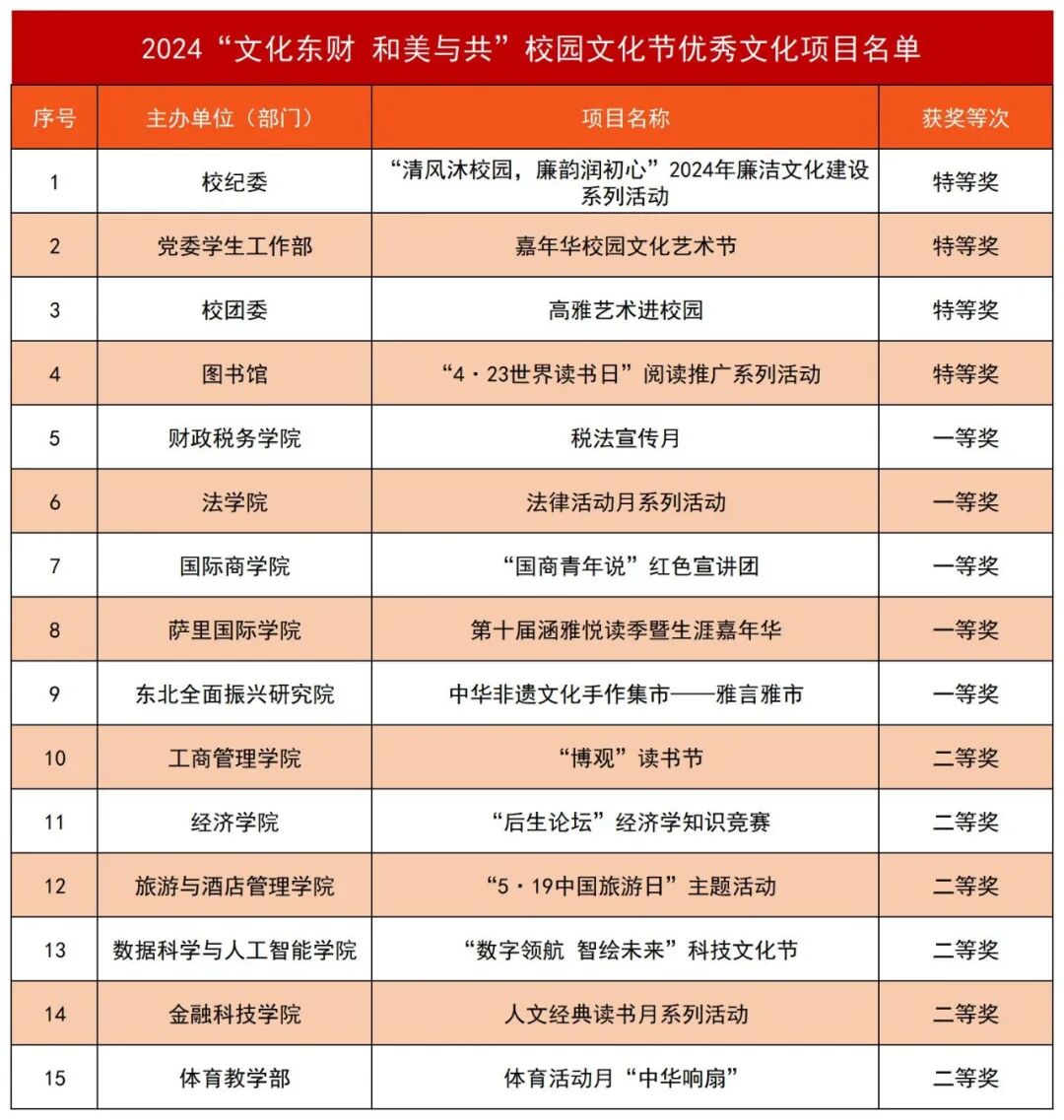 希望受表彰的项目和个人珍惜荣誉、再接再厉,发挥好模范带头作用,为提升学校文化软实力作出新的更大贡献。全校各单位各部门要总结经验、学习先进、突出特色,持续深入学习贯彻习近平文化思想,在守正创新中担负起新时代新的文化使命,传承凝练弘扬东财精神,持续打造特色文化品牌,着力推进“一院一品”文化建设,凝心聚力推动文化育人成效全面提升,为学校“双一流”建设和各项事业高质量发展提供坚强思想保证、强大精神力量、有利文化条件。