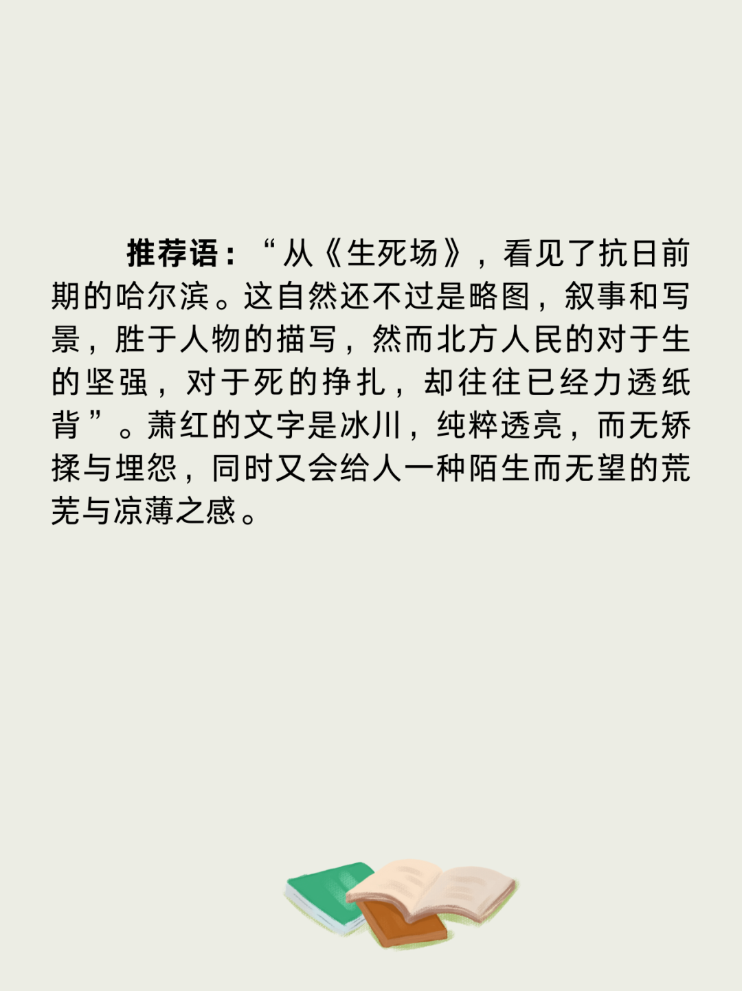 初识萧红,是在小学三年级的课本里,变化万千的火烧云让我爱上了天空,也记住了萧红。后来,又看到了童稚活泼的笔触下世外桃源般的后园和慈爱的祖父。我单纯的以为这就是萧红在文学创作上的一贯风格,想当然地给她贴上“明丽鲜艳、自然直率”的标签。而今读完了《生死场》,我才知道,那仅是残存的一丝温情和生机。隔着阅读的窗户,感受他人的喜怒哀乐,看看他们的一生,走好自己脚下的路。