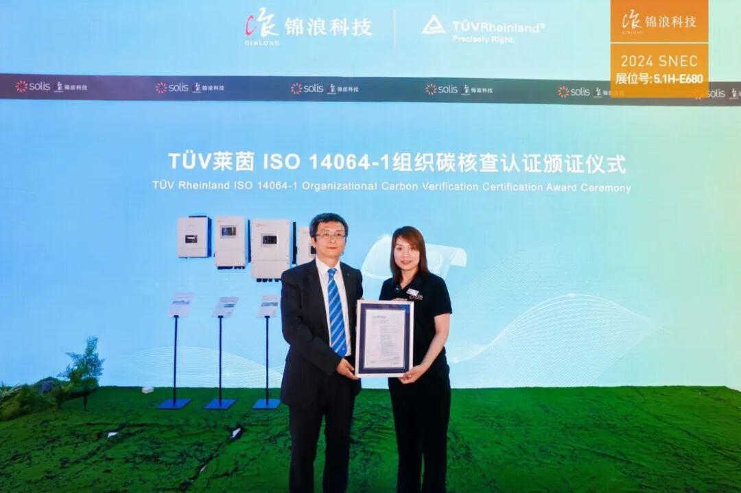 展会现场,锦浪获颁国际独立第三方检测、检验和认证机构德国莱茵TUV大中华区(简称“TUV莱茵”)的碳核查证书,锦浪科技副总经理陆荷峰、TUV莱茵大中华区代表出席了颁证仪式。该证书的获得,充分表明锦浪通过了独立第三方温室气体排放的全面分析和审核认证,认证结果符合国际主流标准,也标志着锦浪在温室气体排放的量化和管理方面迈出了重要一步。