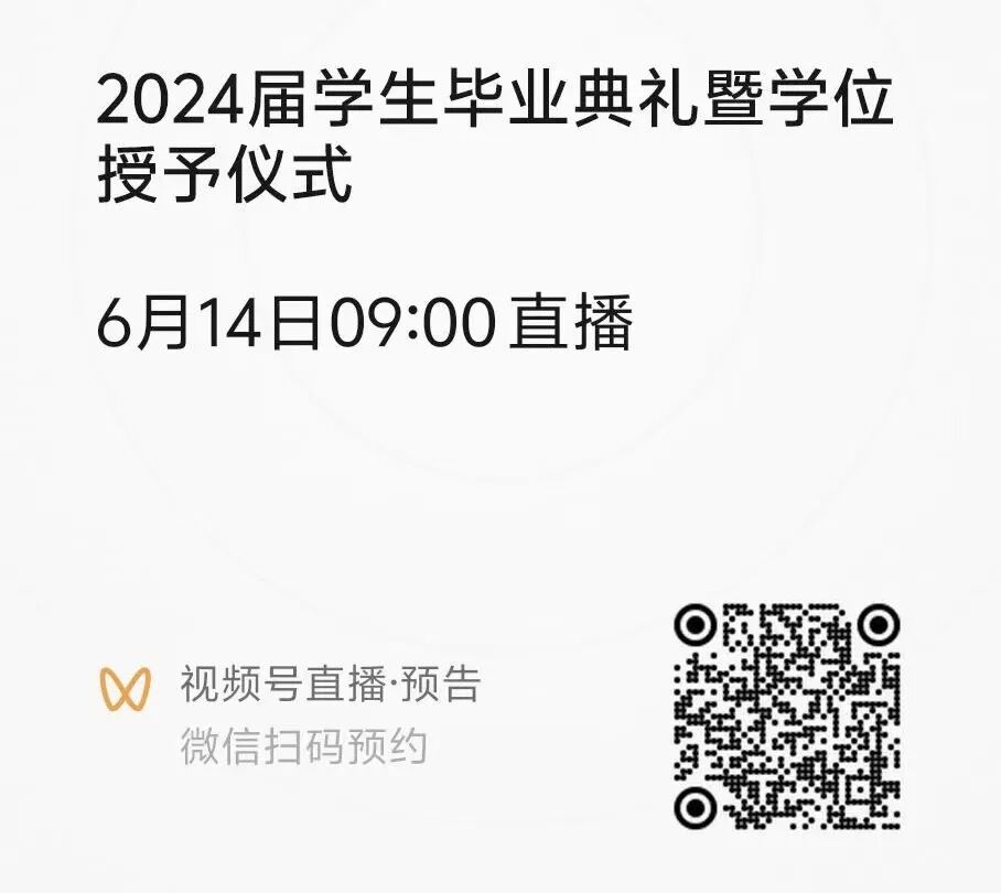 本次学生毕业典礼暨学位授予仪式将在微博、视频号、抖音、快手、B站等平台同步直播,扫码即可预约观看直播。