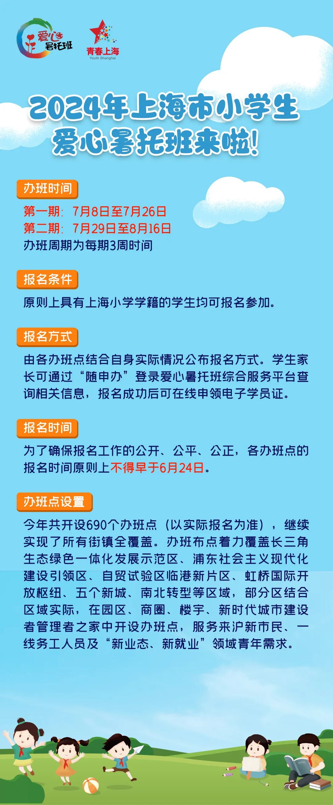 为缓解全市小学生暑期“看护难”问题,引导和帮助小学生度过一个安全、快乐、有意义的假期,团市委、市教委等单位决定在全市开办小学生爱心暑托班,为小学生提供暑期看护服务。此项目已列入2023-2025年上海市民心工程,2024年上海市为民办实事项目。