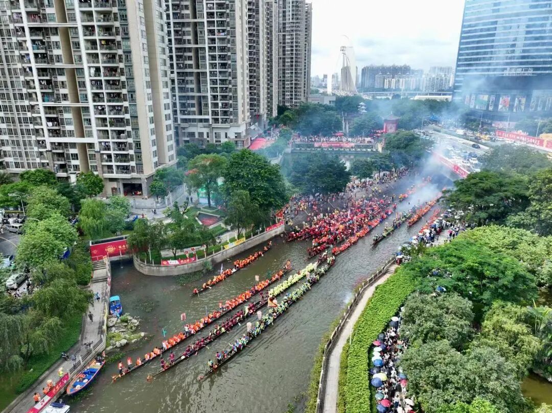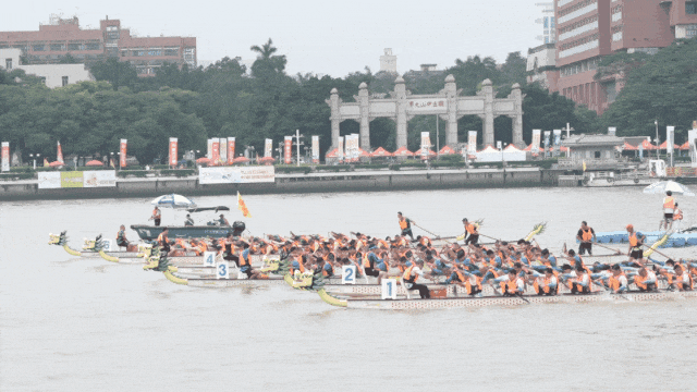 记者观察发现,叠滘龙舟赛近年备受关注与视频传播兴起关系密切,“航拍”等已经是常规手段,“舵手第一视角”“慢镜头”等拍摄方式和新视角让镜头更有感染力,令受众更有代入感。今年叠滘龙舟赛现场的广告数量远超以往,每一场比赛有赞助商,绝大部分的参赛队伍也有自己的赞助商,这与其受到的关注和热度相辅相成。包括央媒在内的主流媒体对比赛进行了直播,自媒体的短视频浏览量也频频出现“10万+”。端午节当天,正逢猎德石牌招景,上百条龙船齐聚广州珠江新城CBD的猎德涌段,两岸彩旗飘扬,人潮涌动,热闹非凡。![56]()