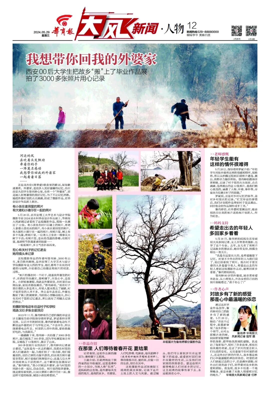华商报以“我想带你回我的外婆家”为题,整版报道我校艺术与设计学院摄影专业2024届毕业生昝肖婷,原文如下: