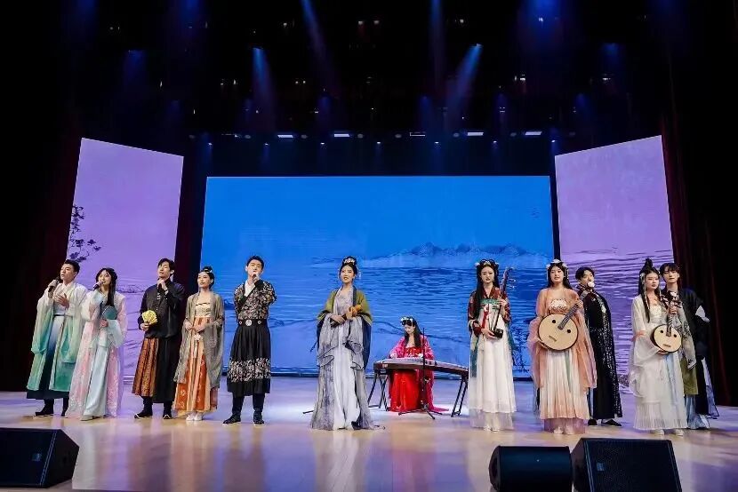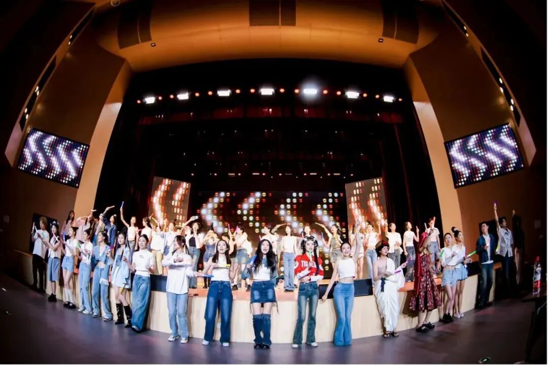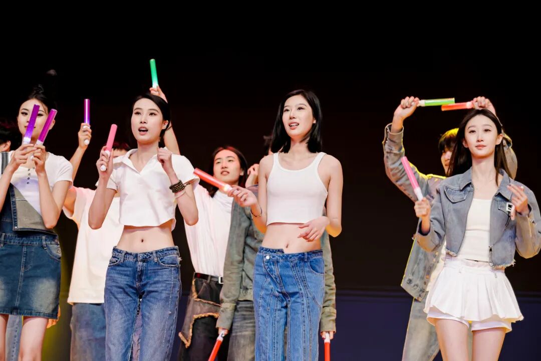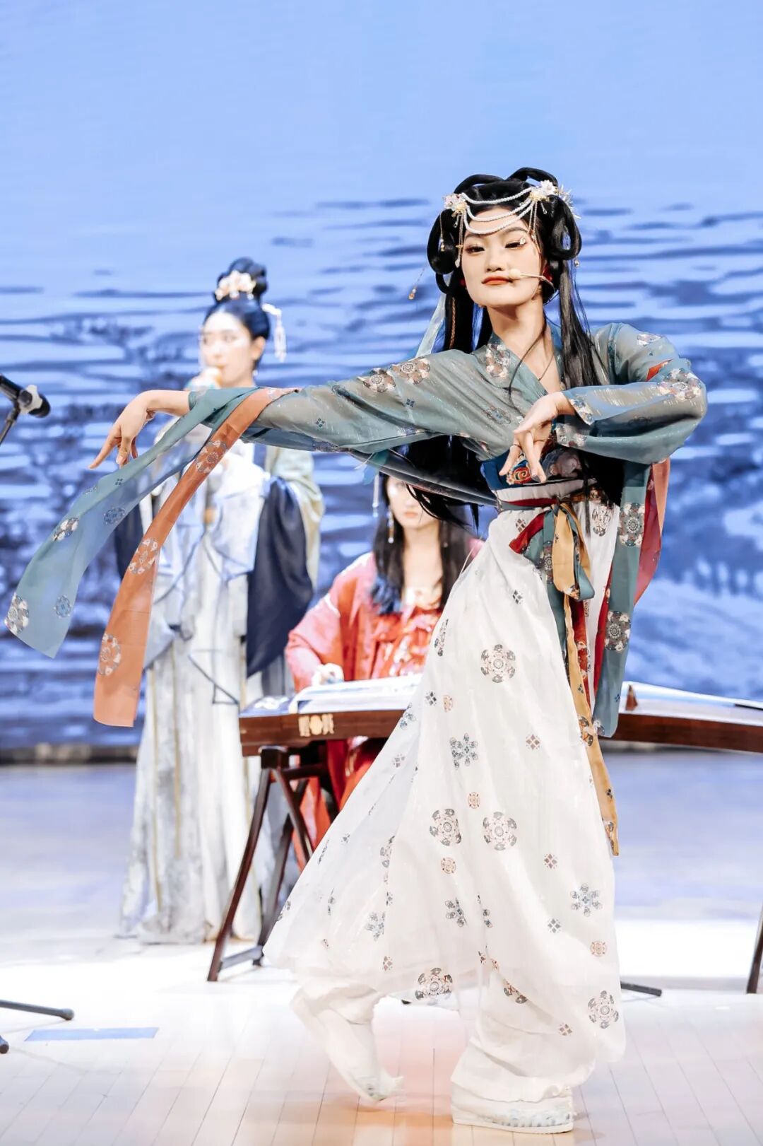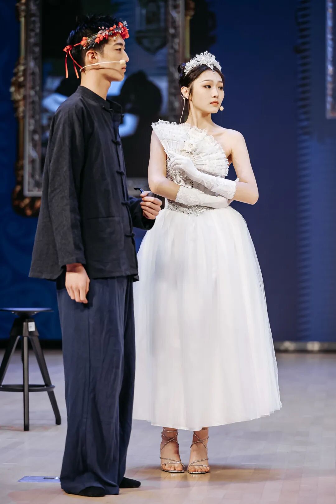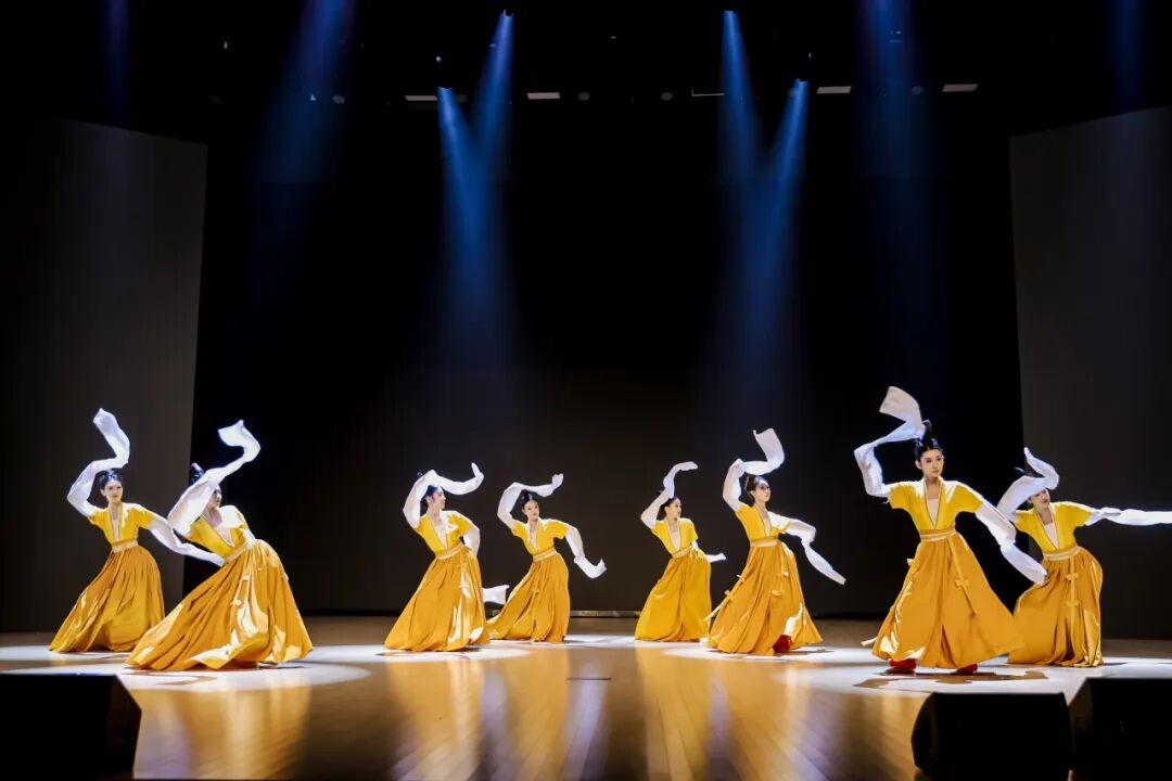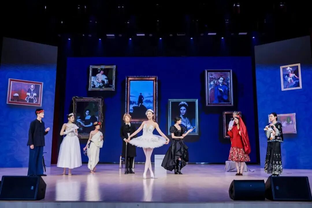 2024届表演专业的毕业展在时尚剧场中布置了全新展览:白天人来人往的美术馆,随着阵阵广播声宣告展览闭馆。可夜色之下的展馆内,遍布各个展区的中西方名画迎来了画中人的新的一天。舞台灯光闪烁,舞者们身着中国古典服饰,化身千年前的陶俑,跟随音乐节拍,完美地展示出了泥塑作品流畅的线条之美和极富高雅情趣的艺术魅力。舞台上活泼灵动的表演氛围将整场演出点燃,令在场观众无一不沉浸其中。