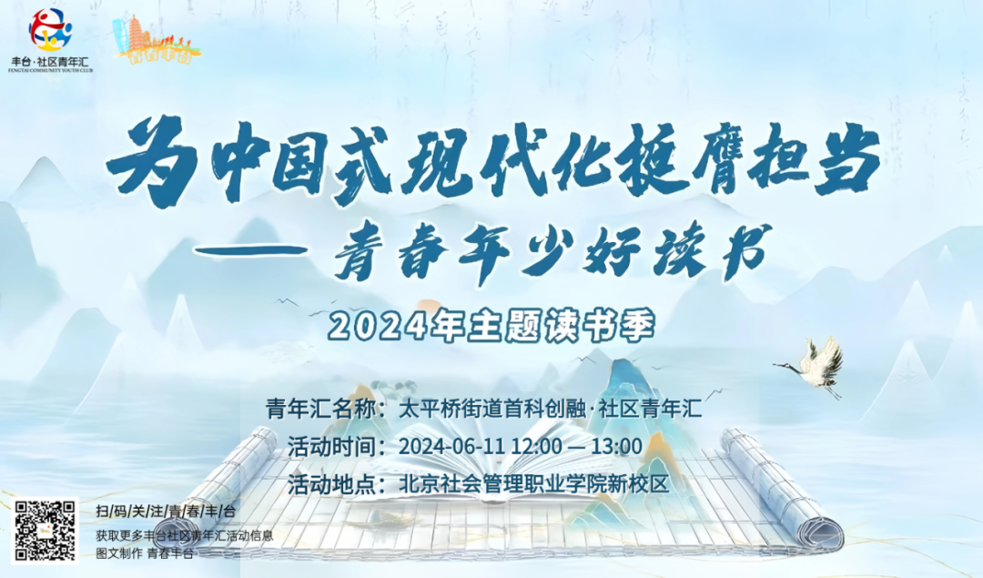 为引导广大青年深学细悟党的创新理论,爱读书、读好书、善读书,努力做到学以致用、知行合一,太平桥街道首科创融·社区青年汇开展“为中国式现代化挺膺担当——青春年少好读书”主题读书活动。