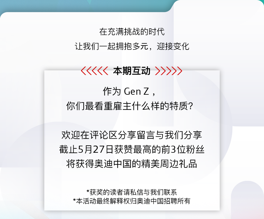 文章内容来源于公众号:奥迪中国招聘,点此可查看原文,内容版权归相关企业所有,本网站仅供交流学习。若涉及版权问题或存在侵权情况,请及时与我们联系,我们将第一时间进行删除处理。