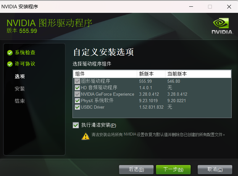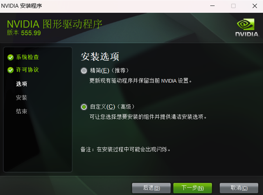 注:安装显卡驱动时勾选自定义,清洁安装