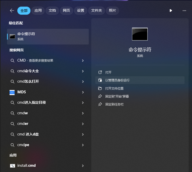 2.搜索输入【CMD】,选择【管理员身份运行】,使用以下命令修复