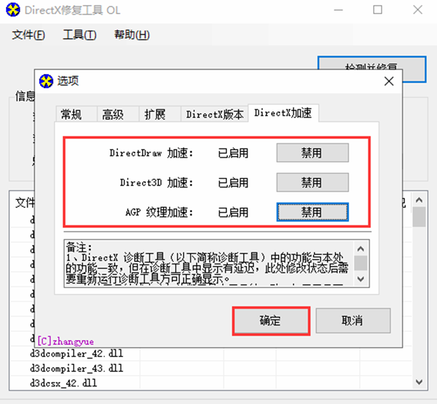 下载安装后打开DirectX检测修复工具,选择检测并修复即可进行修复,左键点击【工具】--【选项】,点击【DirectX加速】,启用所有已被禁用或不可用的加速,点【确定】
