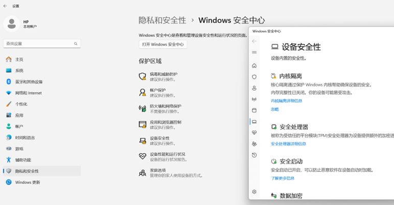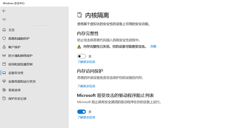 点击【开始】选择【设置】-【隐私和安全性】-【Windows 安全中心】-【设备安全性】,【内核隔离详细信息】,关闭【内存完整性】
