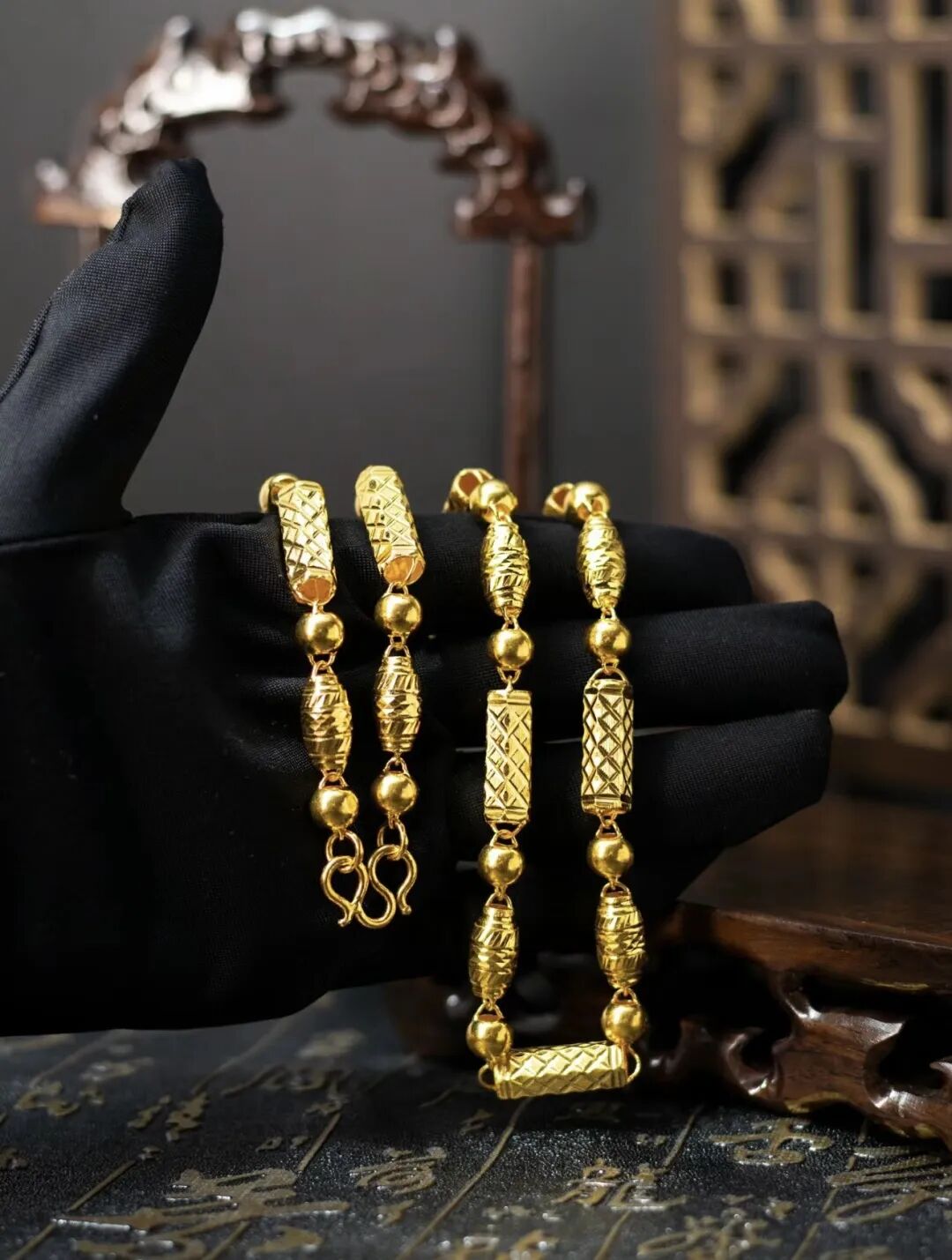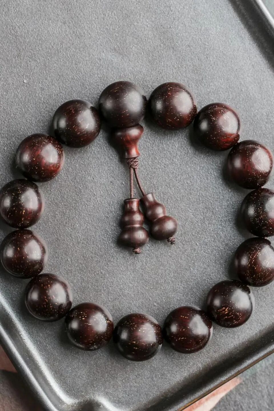 小叶紫檀具有高油密,纹理流畅,牛毛金星,亮泽如蜜等特点,尤其是18MM或20MM手串在凸显男性的霸气与气质的同时兼有旺运的特质,上乘的小叶紫檀珠子的棕眼非常细腻或没有棕眼,质地紧密,手感很好,会有一种坠手感,是男士佩戴手串的优选。