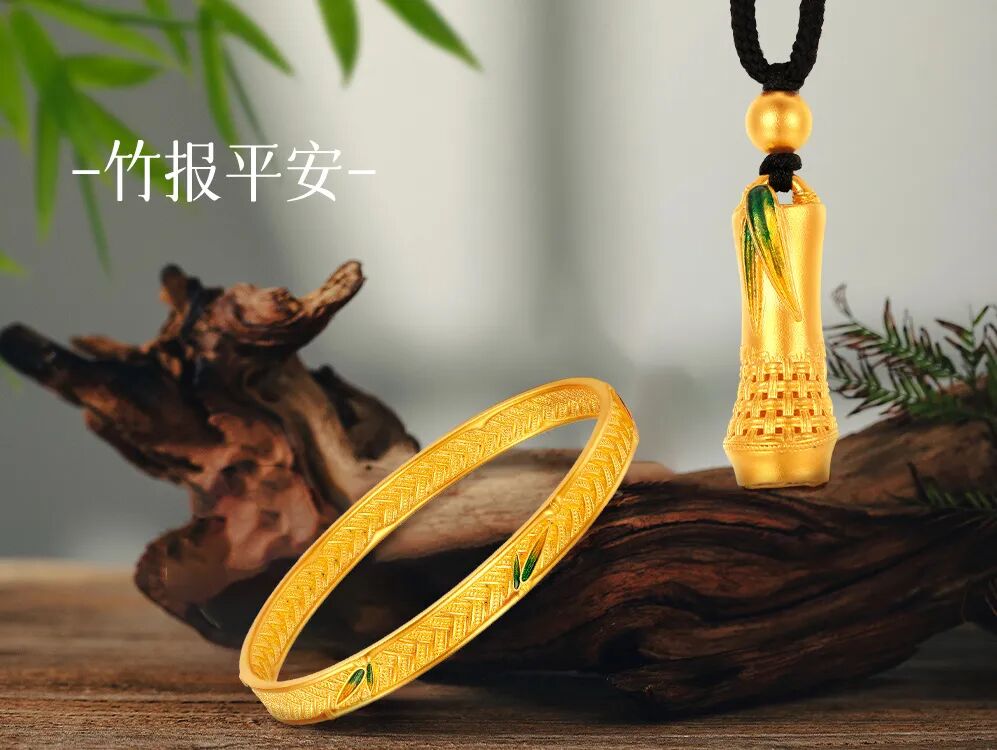 汲取竹节为廓形,竹编纹渐变形态融合其中,竹节有节节高升之意,象征事业顺、财运顺寓意着知“竹”常乐,青翠竹叶衬托出新中式的时尚淡雅青翠。工艺上编织纹理紧密交错,层层交叠,生动的还原竹编肌理的立体感。