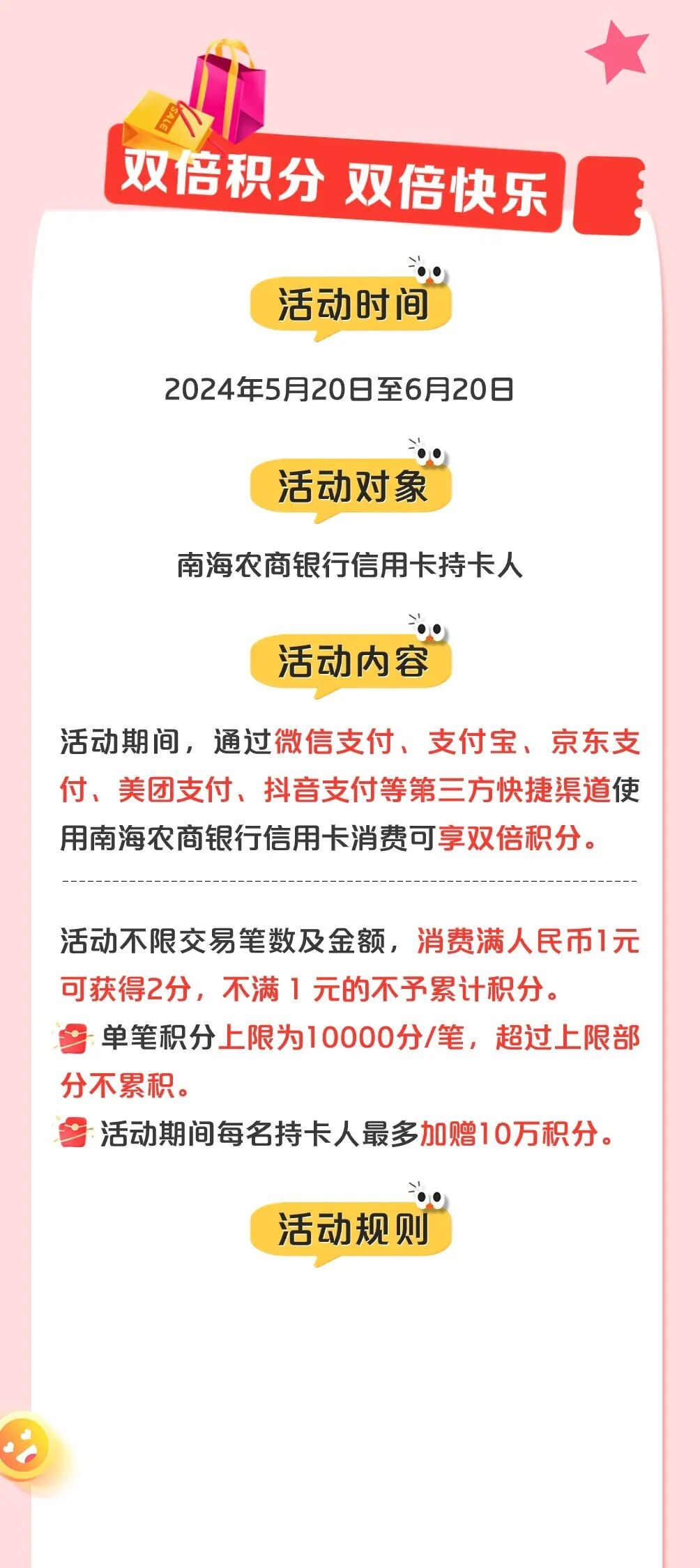 1.活动积分计算规则:活动期内单笔消费每满人民币1元可累计2积分(原1倍积分基础上获赠多1倍积分),不满1元或不满1的整数倍数的不予累计。如在活动期间通过微信支付消费3.9元,则该笔消费可获得6积分。单笔获赠积分上限为10000分/笔,超过上限部分不累积。每名持卡人最多加赠10万积分。