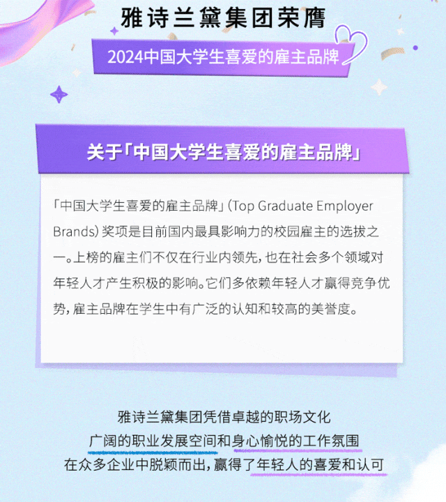 文章内容来源于公众号:雅诗兰黛集团招聘,点此可查看原文,内容版权归相关企业所有,本网站仅供交流学习。若涉及版权问题或存在侵权情况,请及时与我们联系,我们将第一时间进行删除处理。