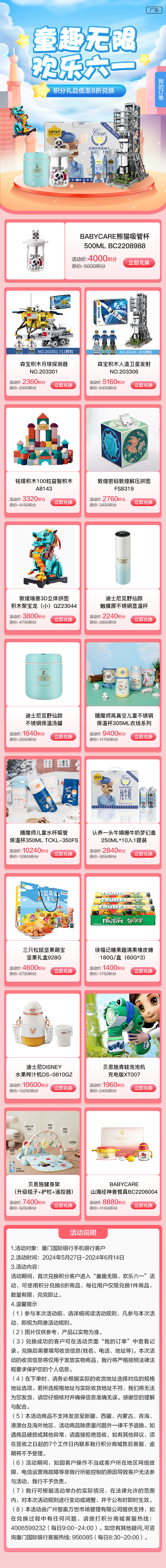 活动期间,首次兑换积分客户进入“童趣无限,欢乐六一”活动,可使用积分兑换8折商品,每位用户仅限兑换1件商品数量有限,兑完即止。