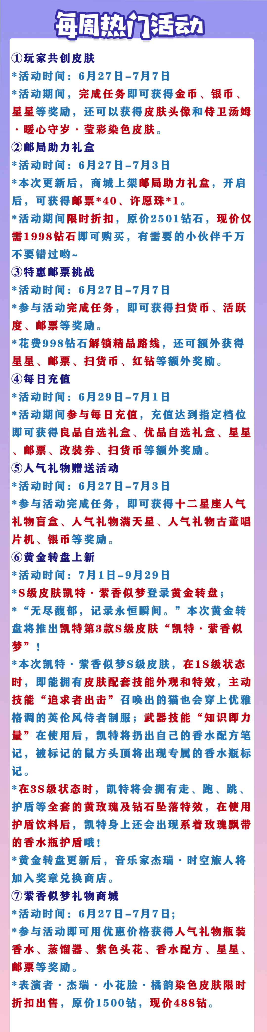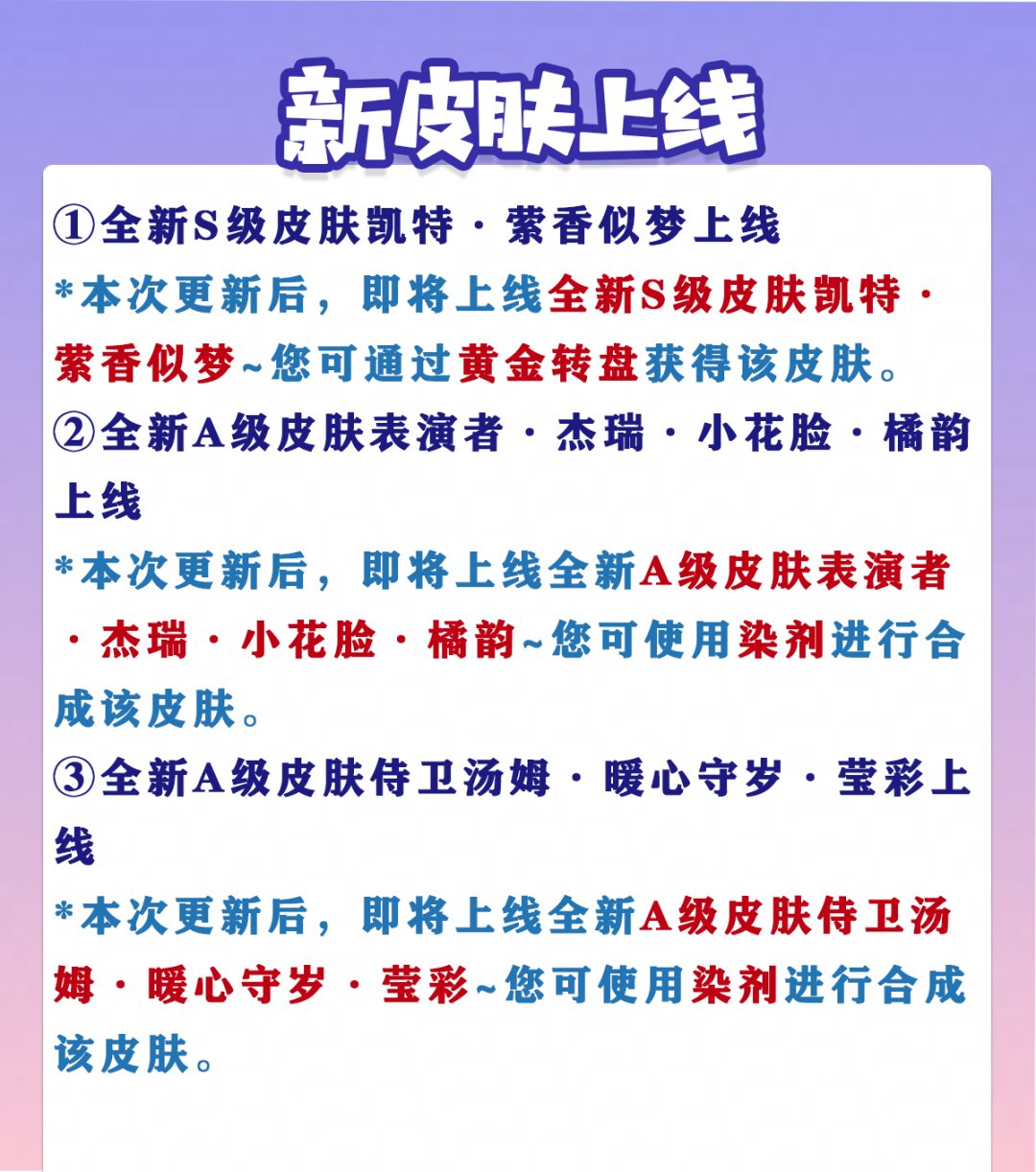 *本次更新后,即将上线全新S级皮肤凯特·萦香似梦~您可通过黄金转盘获得该皮肤。