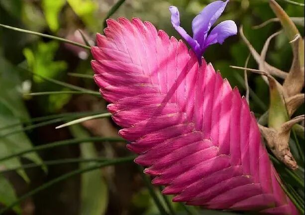 空气凤梨是凤梨植株中特殊的一个类群,它的特别之处就在于生长不需要从土壤中汲取养分,也不必种植在水中。它是只要喷水就可以生长的特殊气生植物。茎和叶上都密布灰白色的鳞片,这些鳞片不仅有助于反射过多的阳光,避免它被太阳灼伤,还能起到捕捉空气中一切可以利用的水气和氮化合物的作用,具有很强的除湿功能。