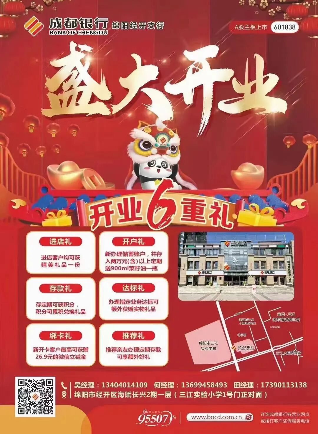 2021年9月,成都银行绵阳分行正式营业,并陆续开设了高新支行、涪城支行和经开区支行,目前在绵已拥有四个网点。