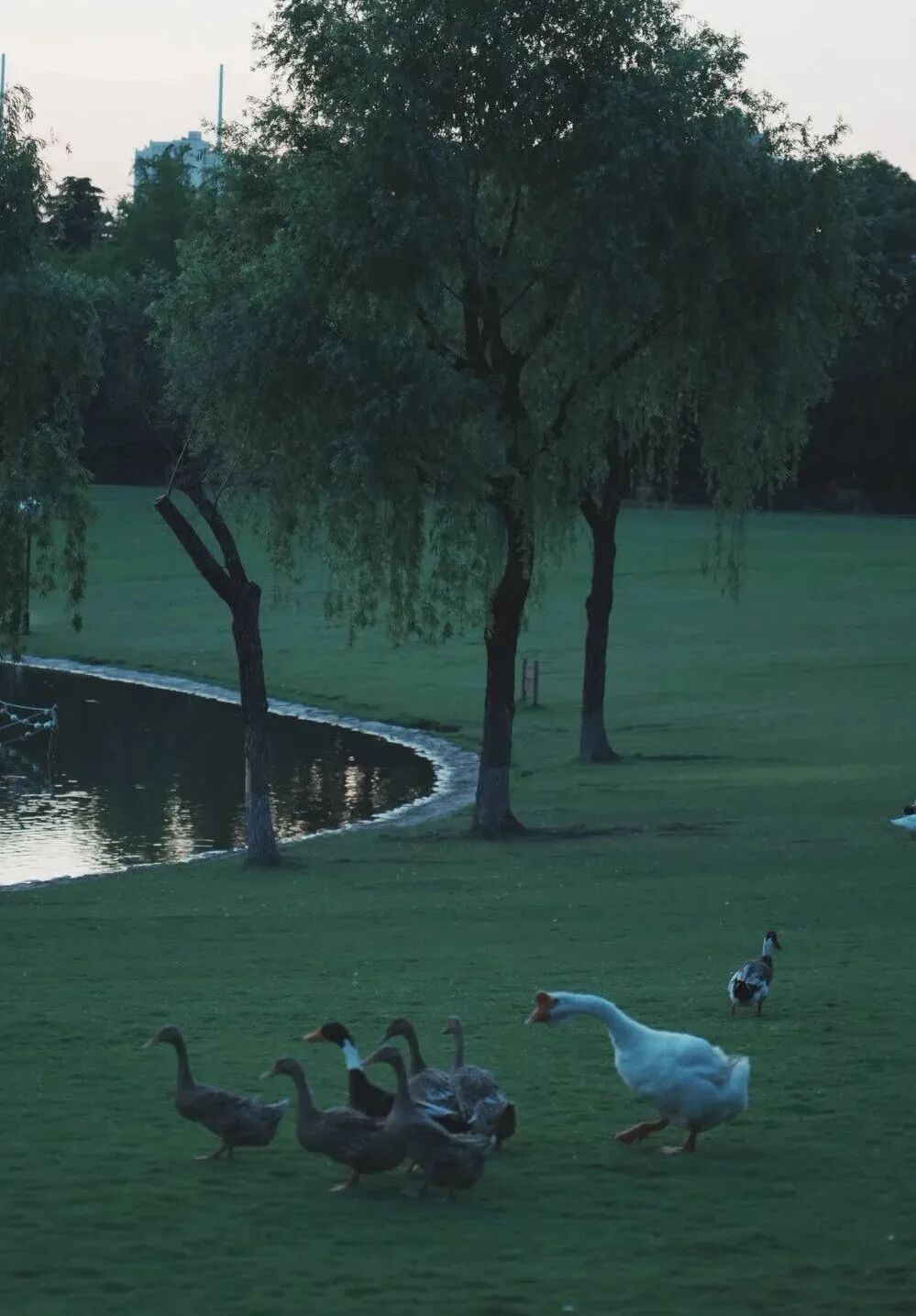日落后湖畔道路两旁照明充足,有24小时安保巡逻,安全感满满,为了方便管理园区还特地引进了机器人“小安”,除了引路外,它还可以给人唱歌解闷甚至具备劝架的功能。灯光下盛开的夏花、湖畔大草坪悠闲嬉戏的鸭子、天鹅,让夏日的晚风都显得更为惬意。