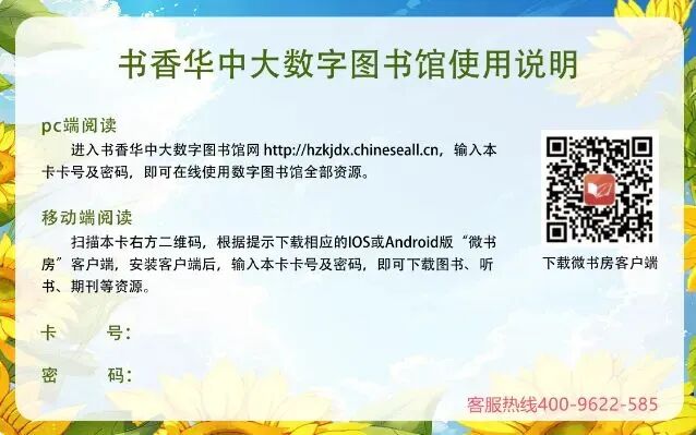华科大为毕业生们准备了毕业阅读卡,登录“书香华中大数字图书馆”,可随时随地免费阅读10万册数字图书、3万集有声图书以及近千种期刊杂志,资源囊括经典名著、名家小说、畅销书籍、教育读物、文艺精粹、网络原创等各类大众社科图书。通过卡片上的账号、密码,可校外登录访问、终生使用该库图书期刊资源。将喜爱的图书收藏到自己的专属“书房”,即可永久保留对这本书的阅读权。具体领取步骤,可点击文末“阅读原文”获取。![]()