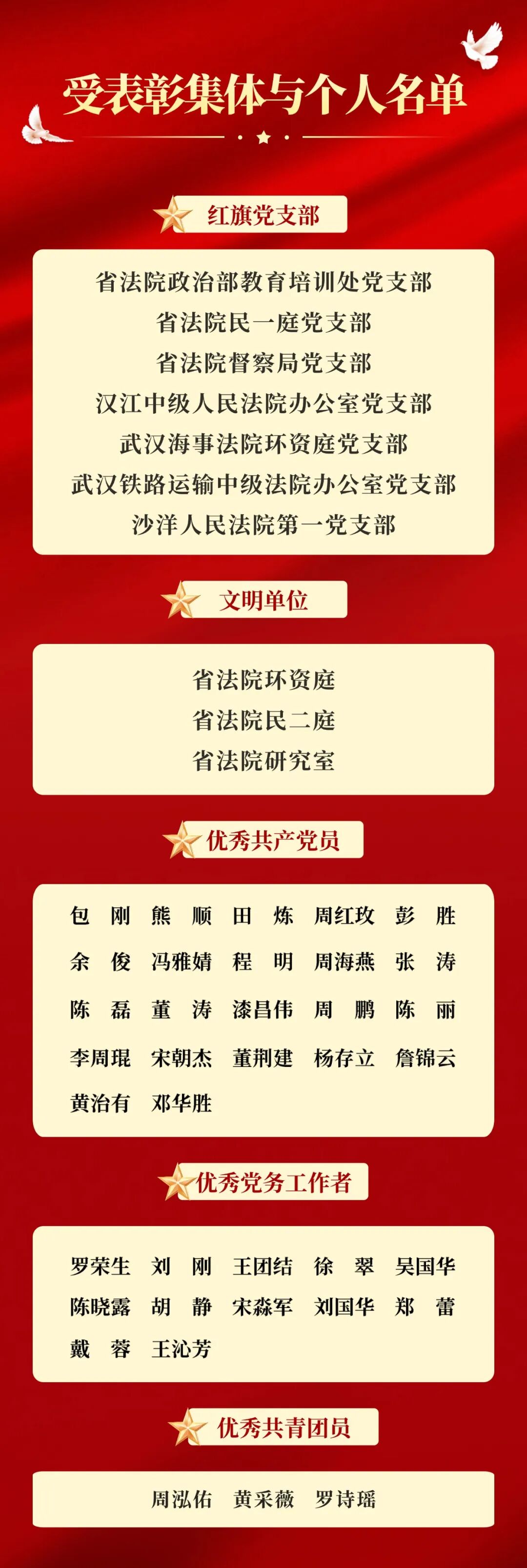 6月27日,省法院召开庆祝中国共产党建党103周年暨“七一”表彰大会。会议表彰了2023年度“红旗党支部”“文明单位”“优秀共产党员””优秀党务工作者”和“优秀共青团员”。省法院党组书记、院长游劝荣以及在汉党组班子成员出席会议并颁奖。省法院机关及直属法院全体党支部书记,省法院机关全体党员干部及部分离退休党员等共600余人参会。省法院党组副书记、常务副院长覃文萍主持会议。