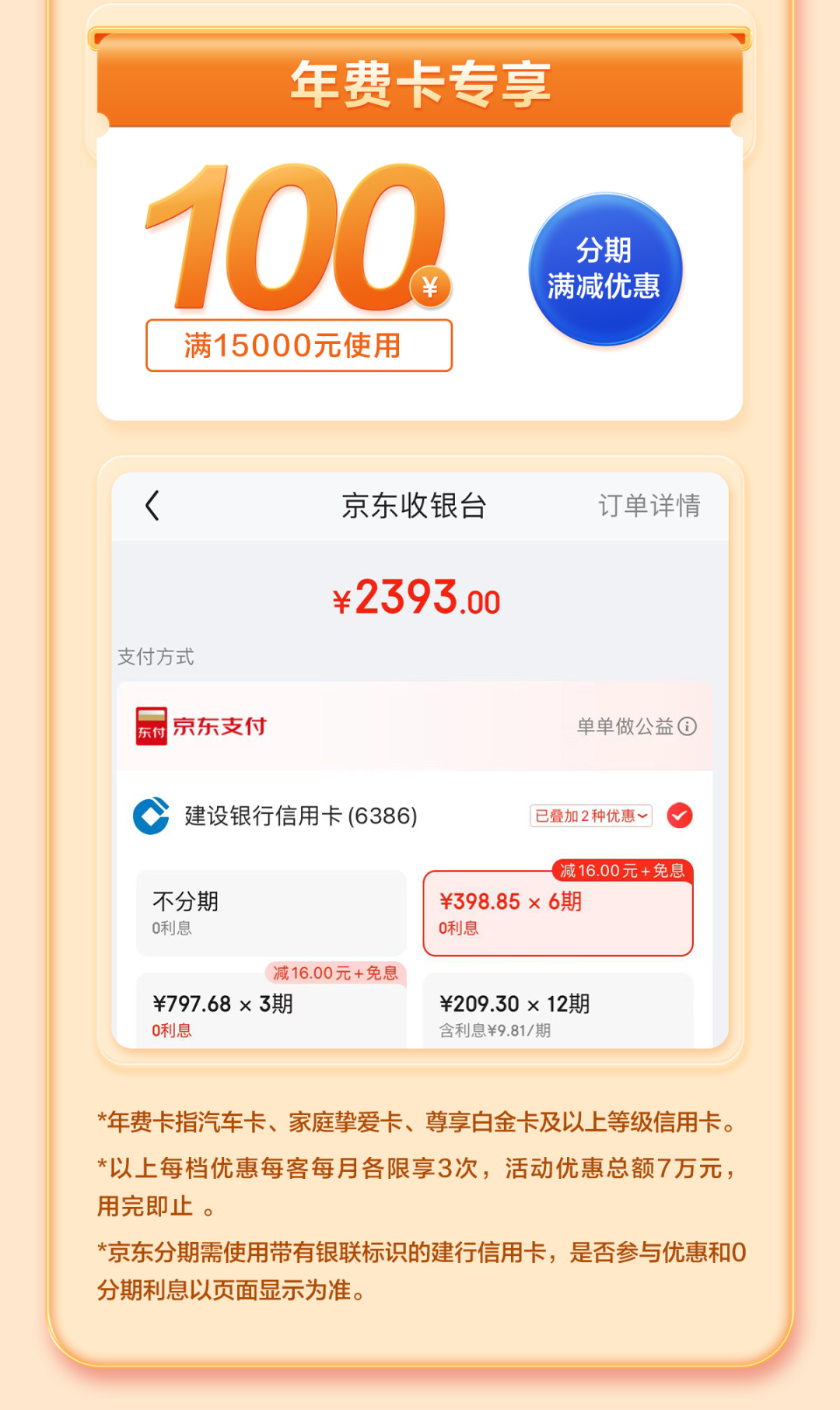 6.若用户有下述任一情况,包括但不限于使用多张卡片或多个账号、使用外挂或插件、批量购买、进行虚假交易、恶意套利、参与活动的账户若于活动期间出现有逾期还款、卡片已冻结、止付、注销等不正常状态,或有其他违反中国建设银行龙卡信用卡章程、领用协议或相关业务协议的情形,中国建设银行及合作方有权采取以下一种、多种或全部措施,包括但不限于:对相关消费进行调查核实及鉴定;取消其参加本活动的资格;取消订单或扣除通过不正当方式参加活动获得的优惠,若无法取消或完整扣回的,则可直接从用户参与活动的龙卡信用卡账户中扣减相关优惠价与原价之间的差额;拒绝其今后参加中国建设银行及合作方的任何优惠活动;对“套现、套利”等违规行为进行追索;采取其他法律措施。
