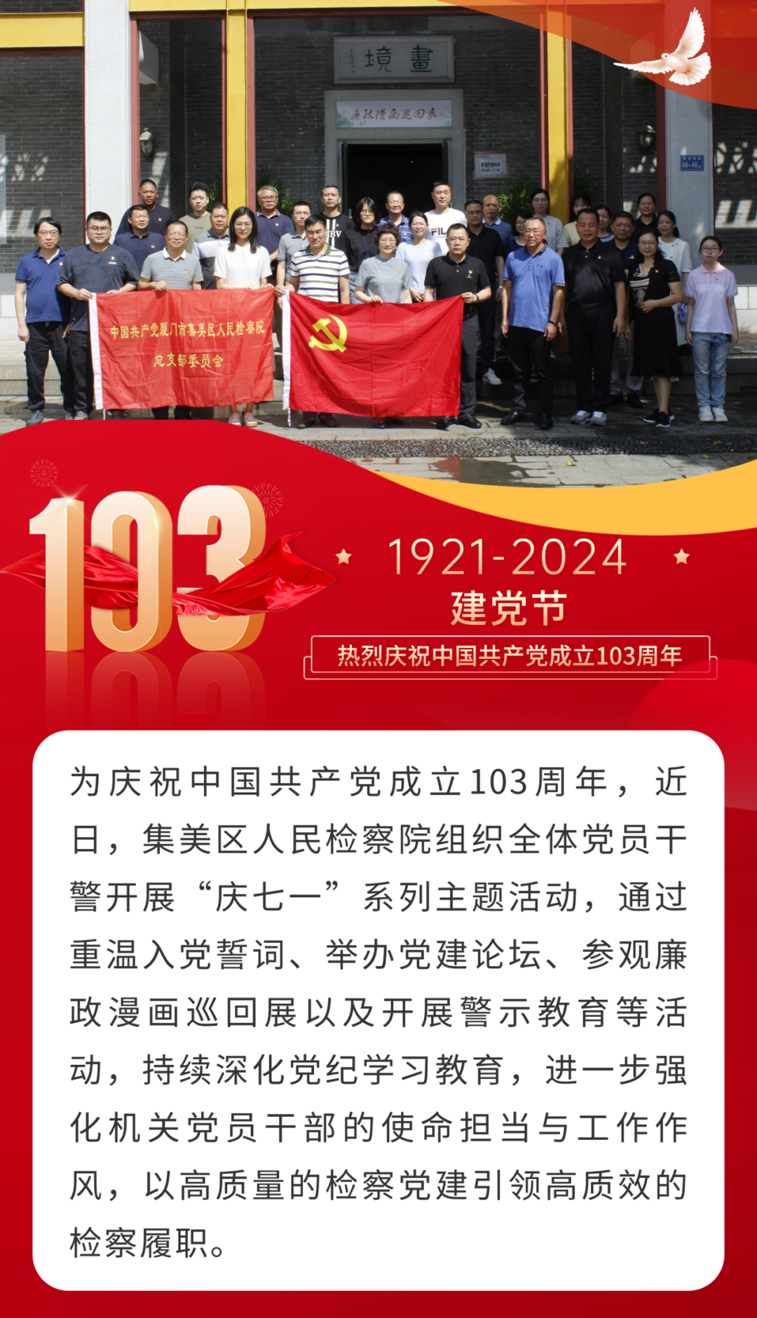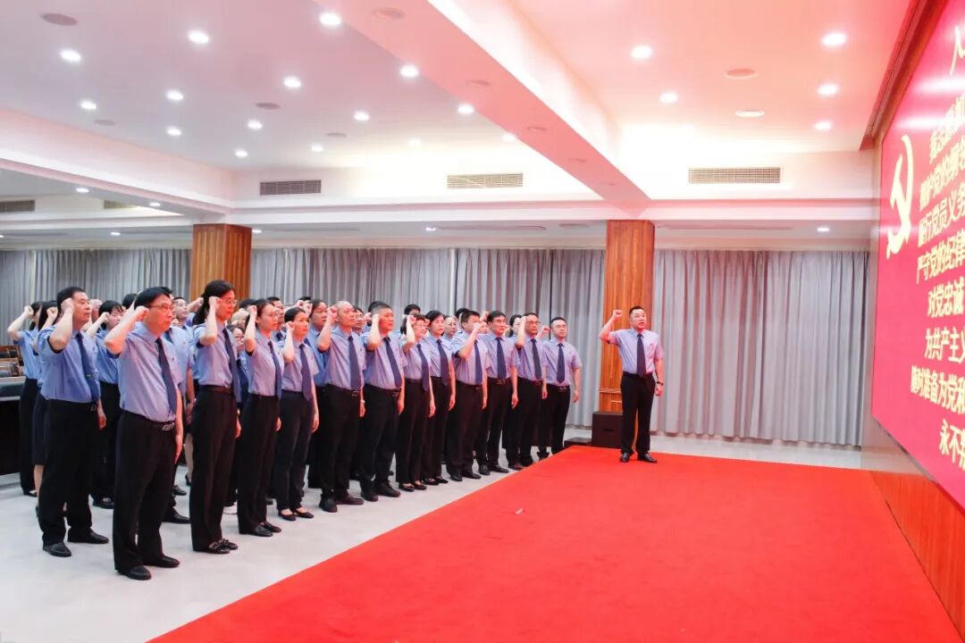 “七一”当天,全体党员干警重温入党誓词,重忆入党初心,表示永葆党员先进本色、全力践行忠诚履职的誓言、在各自岗位上再创检察新业绩。