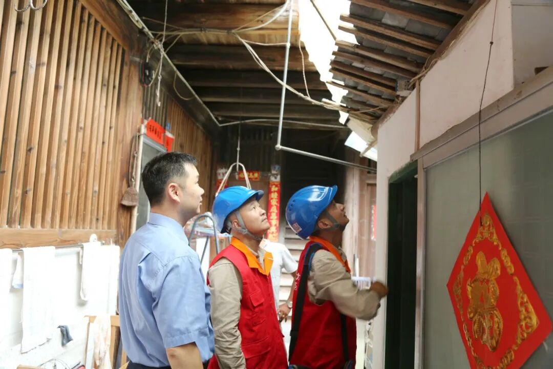 国网南靖县供电公司书洋供电所的党员职工深入土楼,为当地居民进行老化线路的巡检,并为独居老人检查大功率电器是否符合安全标准。