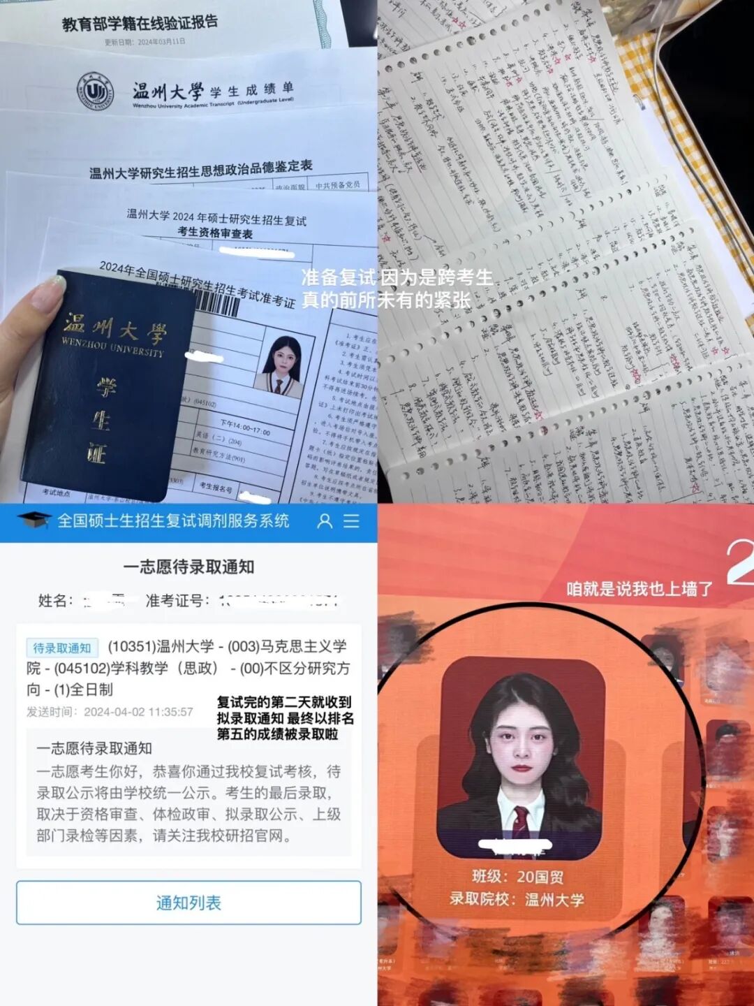 和温大续约三年~在收到录取通知的那一刻总算可以说“轻舟已过万重山”啦!一路走来,除了其他所有人的陪伴与鼓励,最要感谢的是一直坚持的自己,在每一个情绪崩溃的边缘把自己拉回来,在每一个想放弃的瞬间告诉自己没有退路。对我来说,我的目标没那么远大,但是最终靠自己的努力实现了就已经意义非凡。也祝愿看到这里每个人都能所愿皆成真,希望努力和真正自在的你自己能同时构筑你往后的每一天~