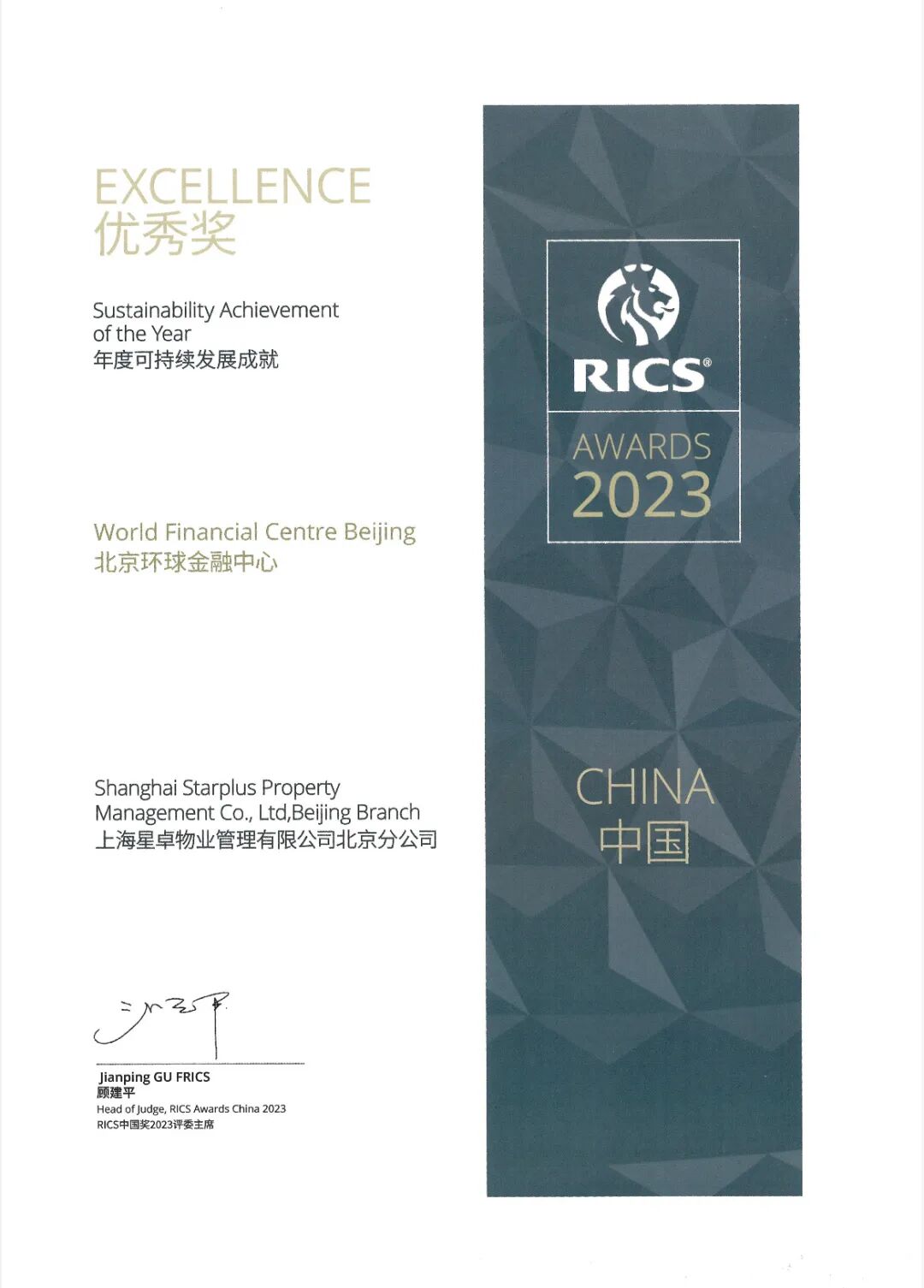 北京环球金融中心荣获RICS 2023年度可持续发展成就 优秀奖。