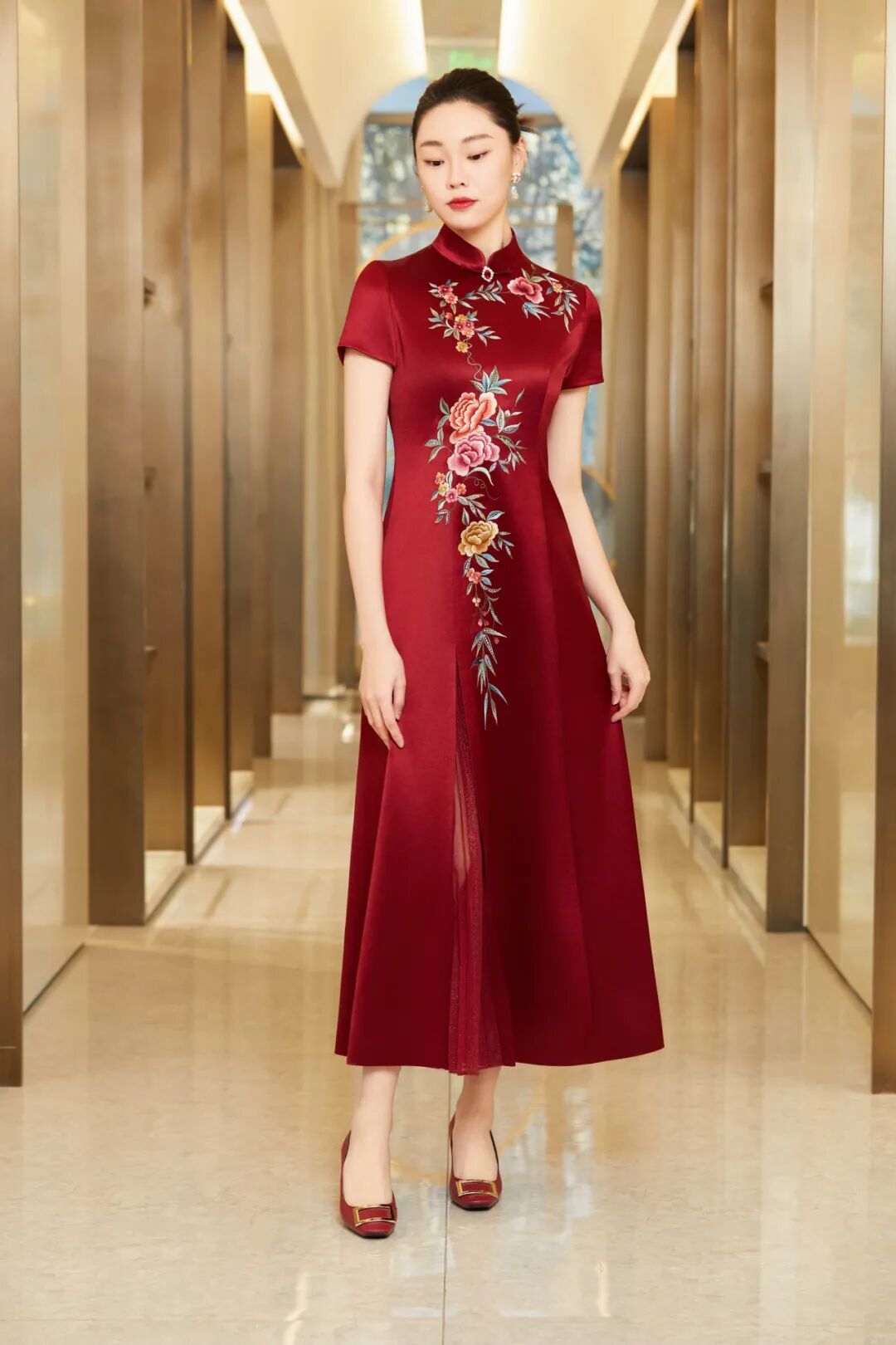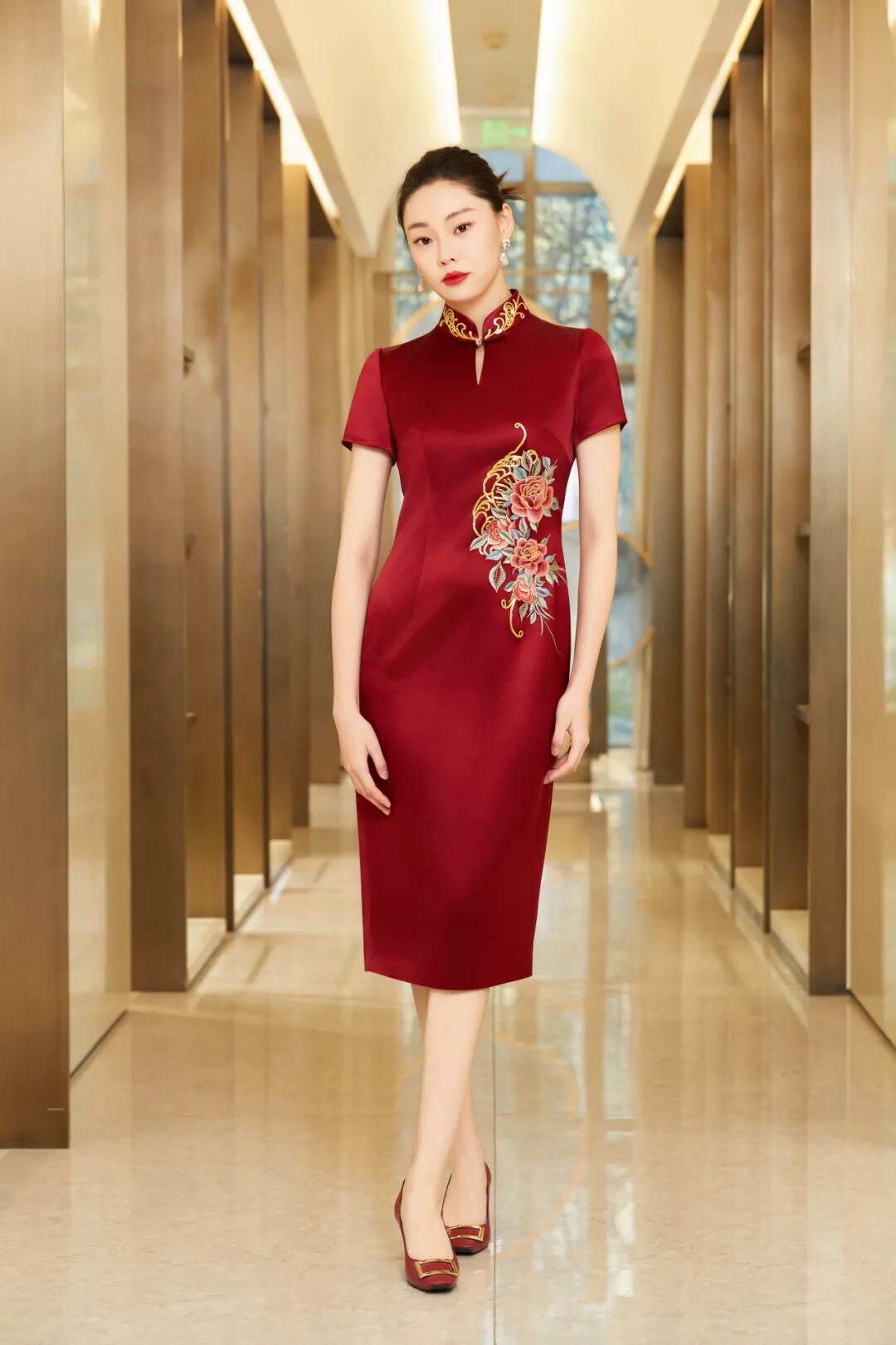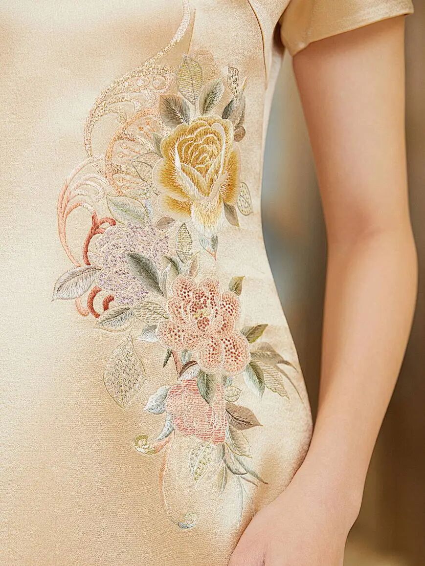 懿菲旗袍<星羽雅亮>,醋酸面料,触感细腻且易于打理。纹样运用盘金手绣工艺,以金线绣制牡丹纹样,彰显高贵典雅。