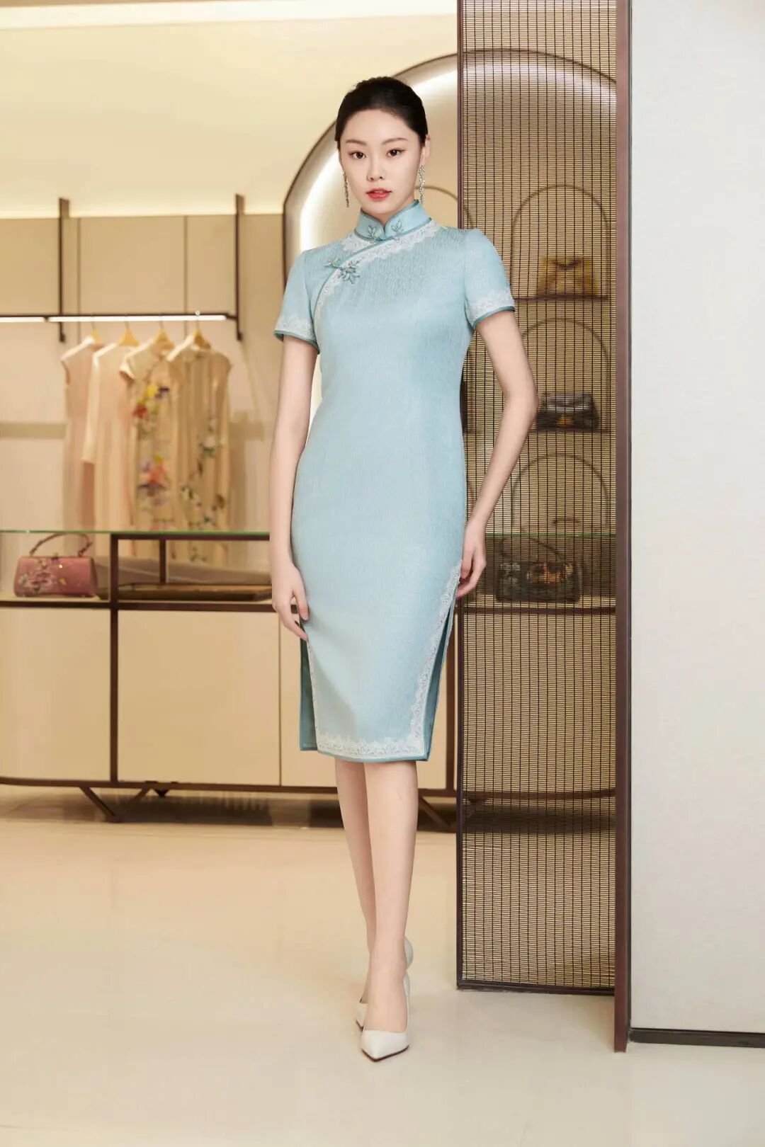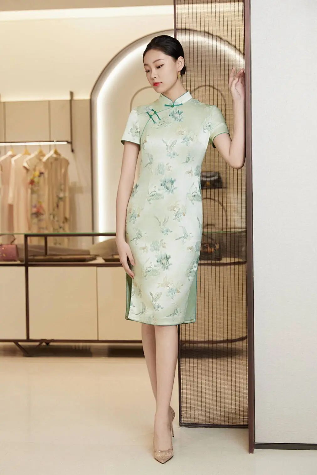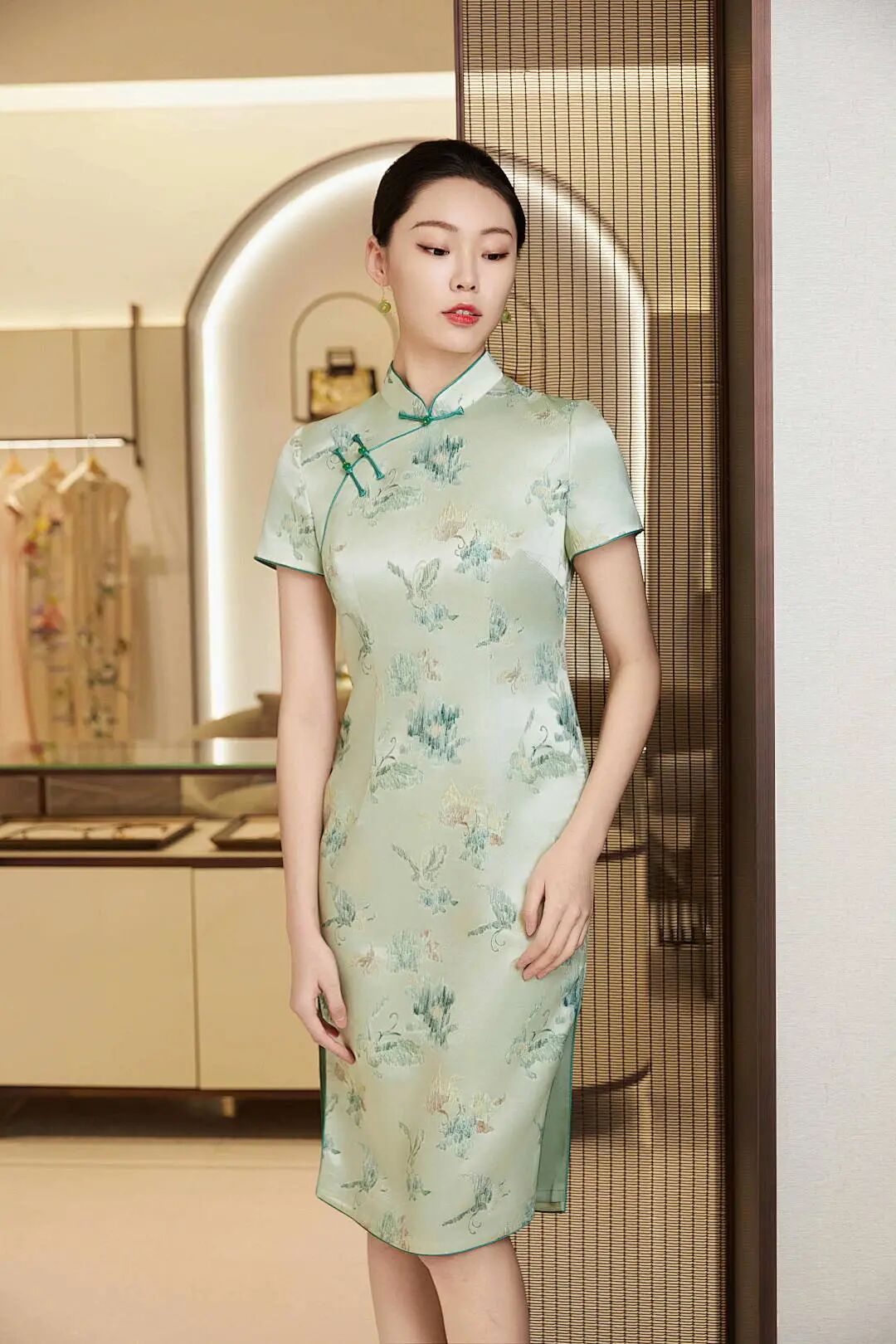 懿菲旗袍<柳宠花迷>,立领设计配上手工扣的精巧,展现出旗袍的优雅之美。