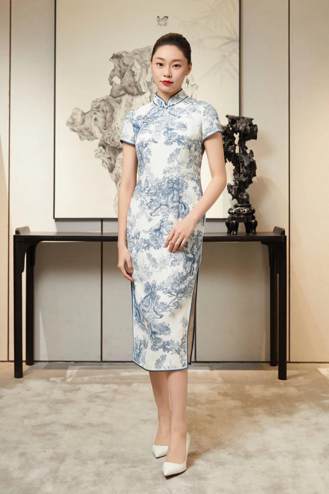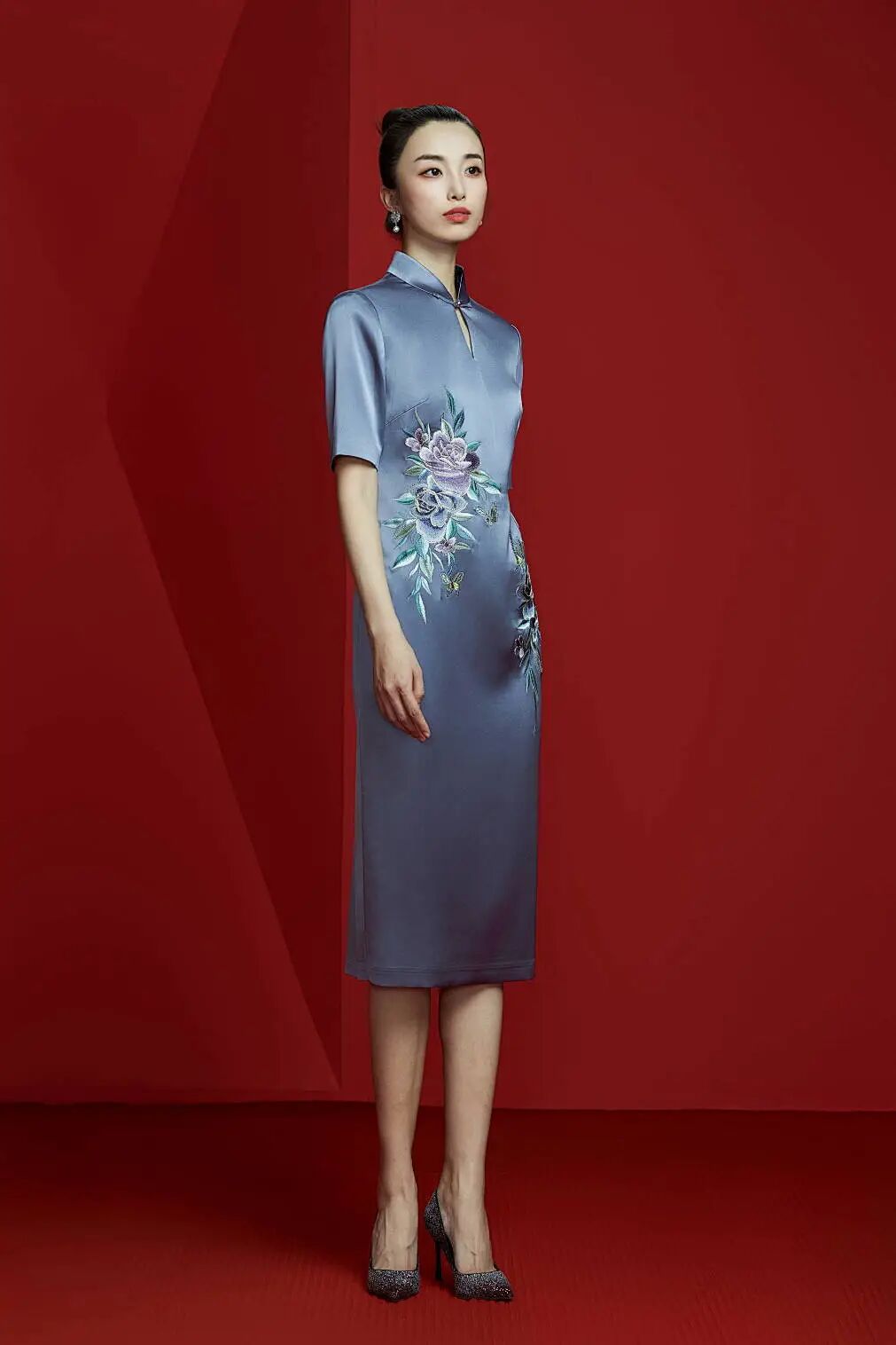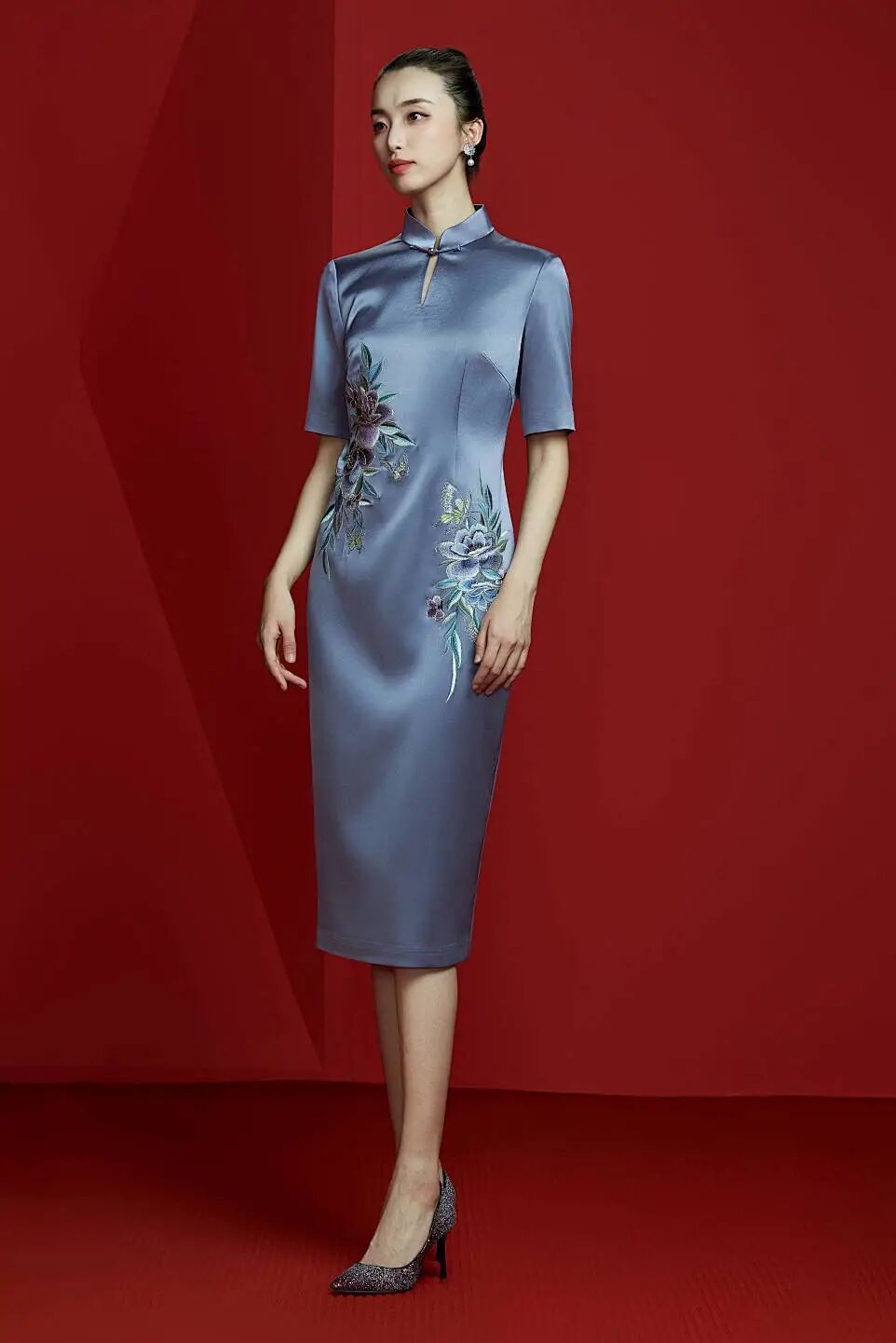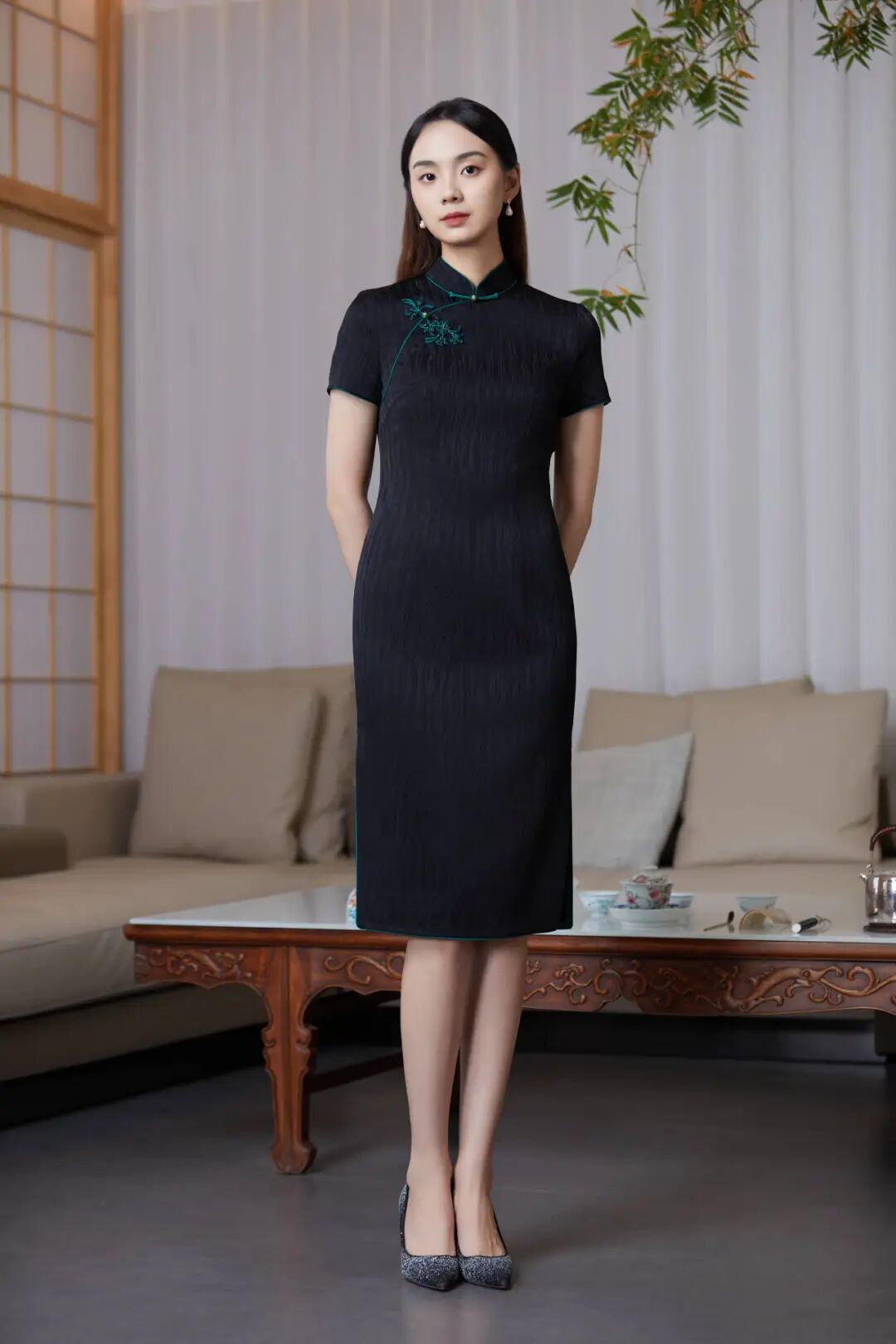 懿菲旗袍<柳宠花迷>,立领设计配上手工扣的精巧,展现出旗袍的优雅之美。