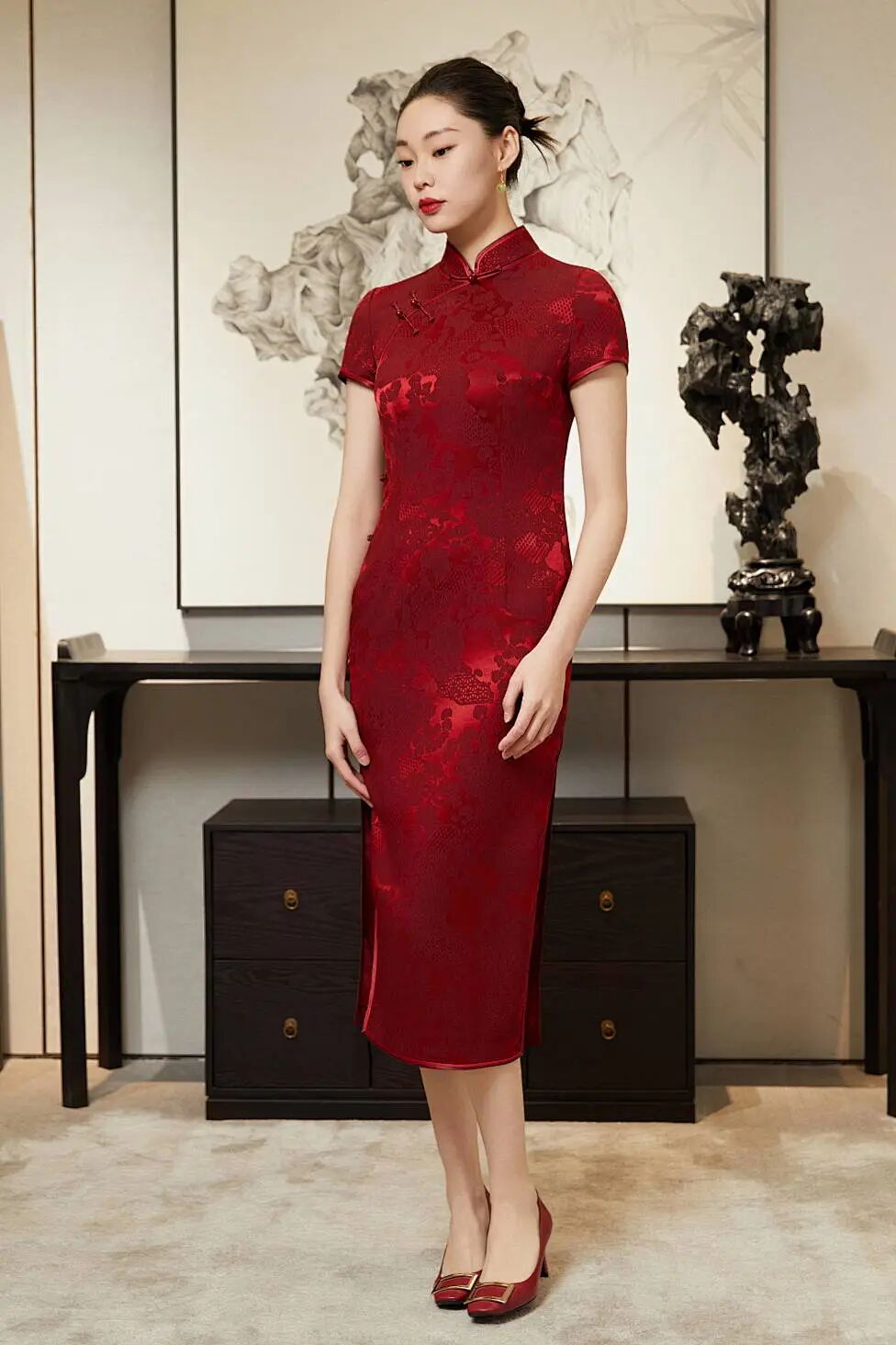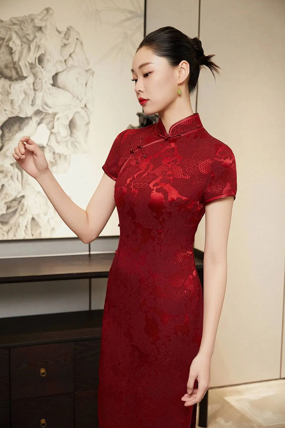懿菲旗袍<玫云松丹>,面料采用真丝冠乐绉,手感柔软、凹凸感使提花视觉上更加立体、分明。