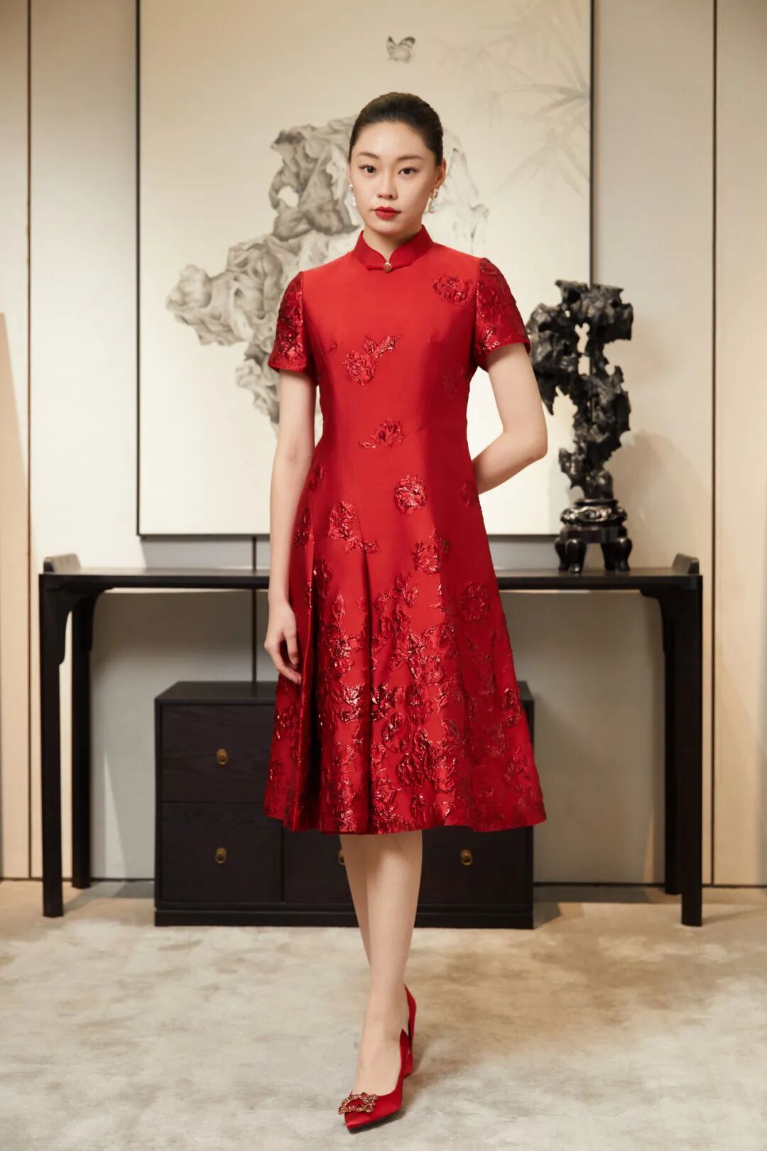 懿菲旗袍<蝶恋丹花>,手工一字盘扣,寓意一心一意,珠扣圆润光泽,象征团圆和美。