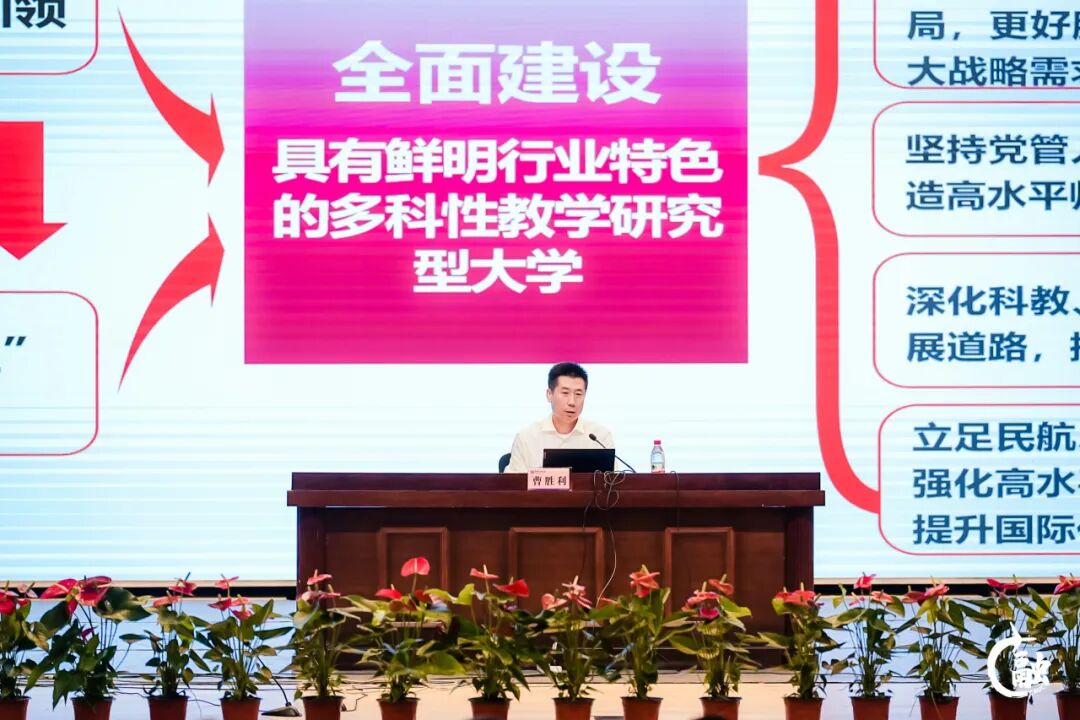 曹胜利强调,要着眼长远、系统谋划,持续以“一融两高两大五抓六要”党建工作体系为引领,坚持教育、科技、人才一体推进,落实“一二三四四五”总体工作思路,全面建设具有鲜明行业特色的多科性教学研究型大学。要反躬自省、自我加压,以巡视整改为契机,坚持把自己摆进去、把职责摆进去、把工作摆进去,一一对账销号,剖析问题根源,对于已完成事项进一步巩固整改成果,防止问题反弹回潮,对于已完成并长期坚持的事项,明确建设思路、长效机制和具体措施,确保巡视整改和成果运用取得实效。要立足当下、打牢基础,为中国特色世界一流民航大学建设不断奋斗。