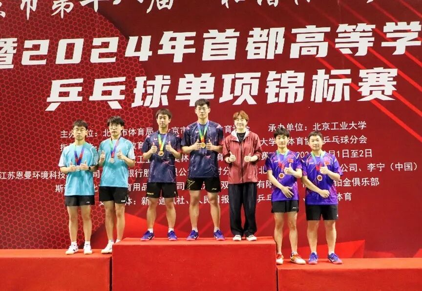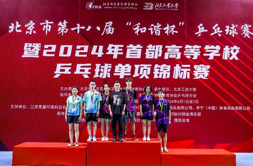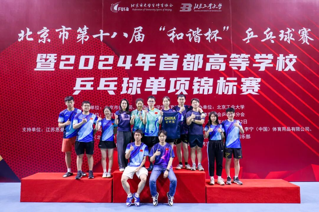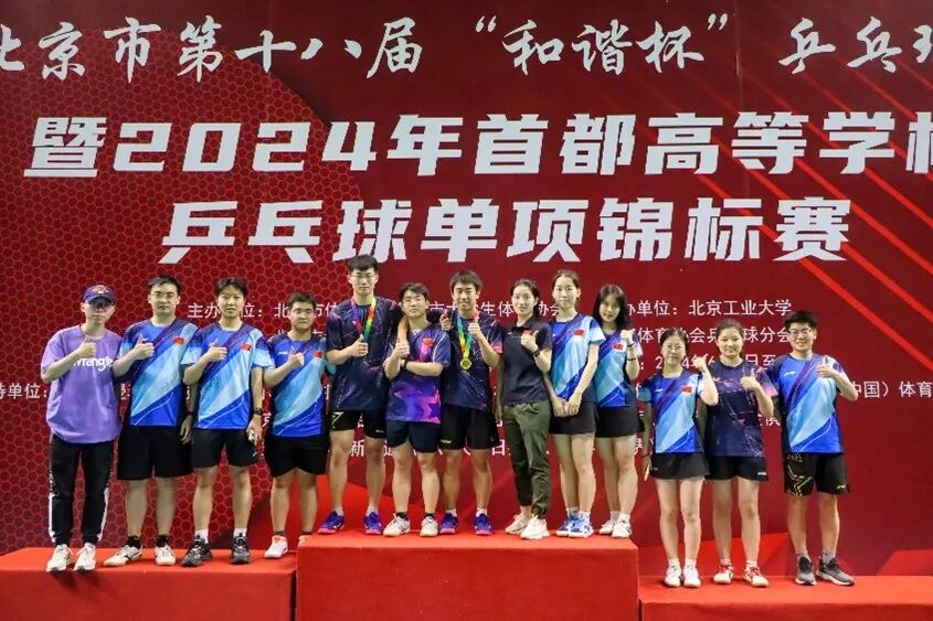 2024年6月1日至2日,由北京市体育局、北京市大学生体育协会主办,北京工业大学承办的北京市第十八届“和谐杯”乒乓球赛暨2024年首都高等学校乒乓球单项锦标赛在北京工业大学奥林匹克体育馆顺利举行。经过2天鏖战,在张老师和孙老师的带领下,我院乒乓球队一举夺得一金一银及一个单项第七名的优异成绩!
