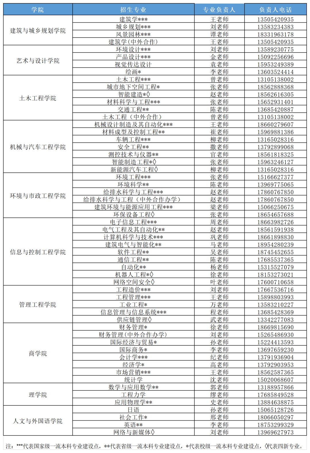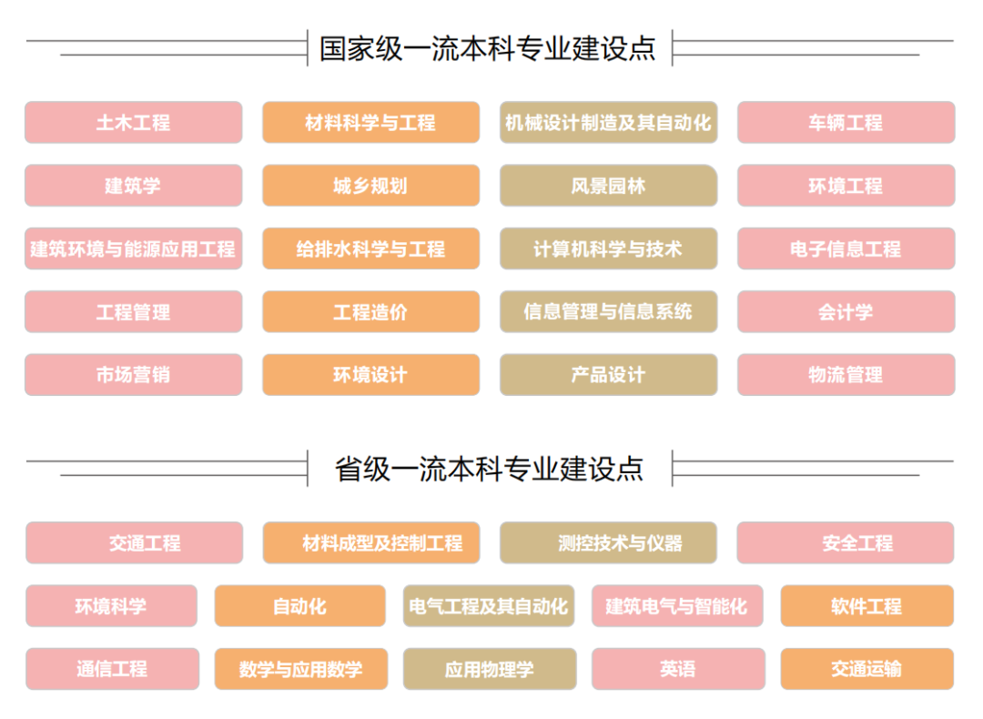 学校充分发挥优势学科人才和科研优势,强化专业内涵,积极推进品牌专业、特色专业建设,获批国家级特色专业4个,国家本科专业综合改革试点专业1个,省级品牌、特色专业13个,国家级卓越工程师培养计划试点专业6个,山东省新旧动能转换专业对接产业项目3个,山东省应用型高水平专业群6个,通过住房和城乡建设部土建类专业评估专业5个,通过工程教育专业认证专业10个。学校共有69个本科专业,20个专业入选国家级一流本科专业建设点,34个专业入选省级以上一流本科专业建设点。2024年学校62个专业招生,其中新工科专业10个,新文科专业2个。