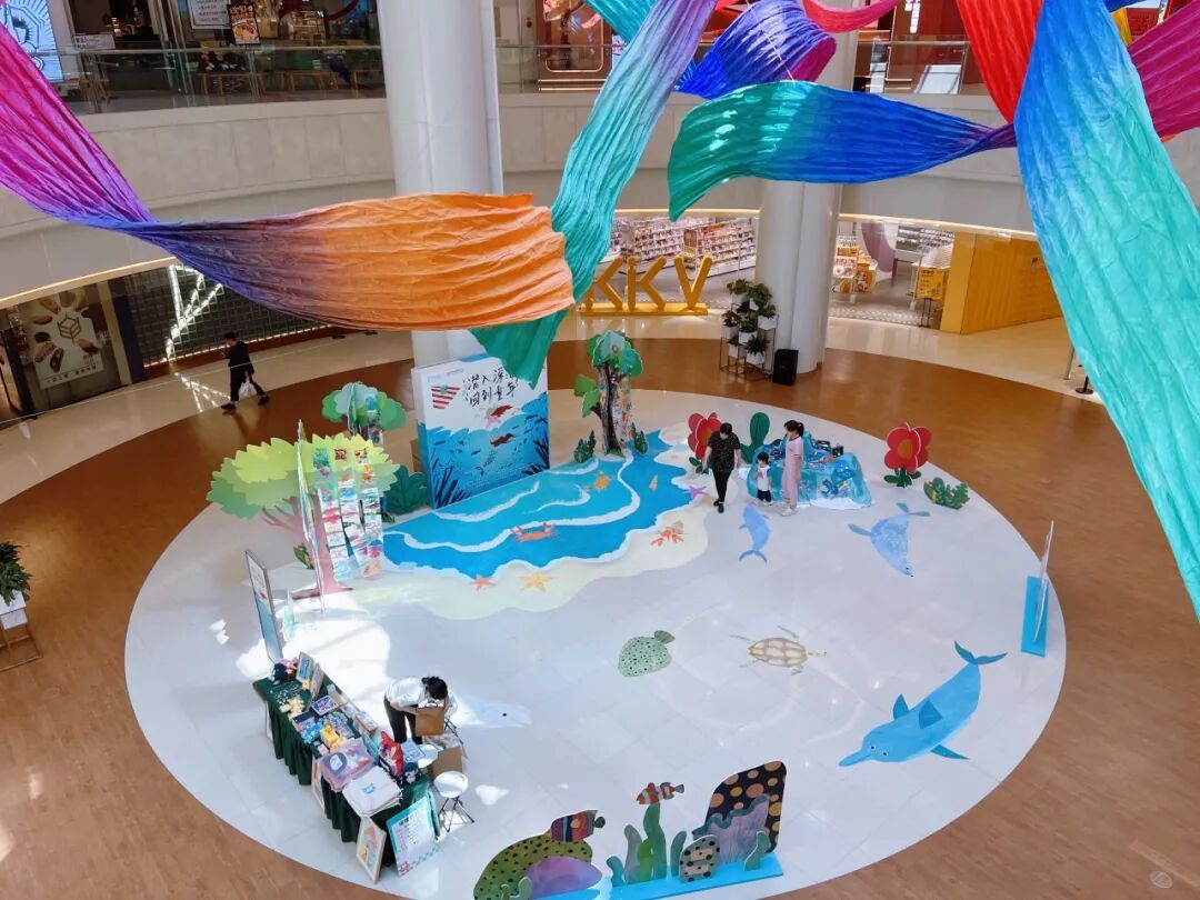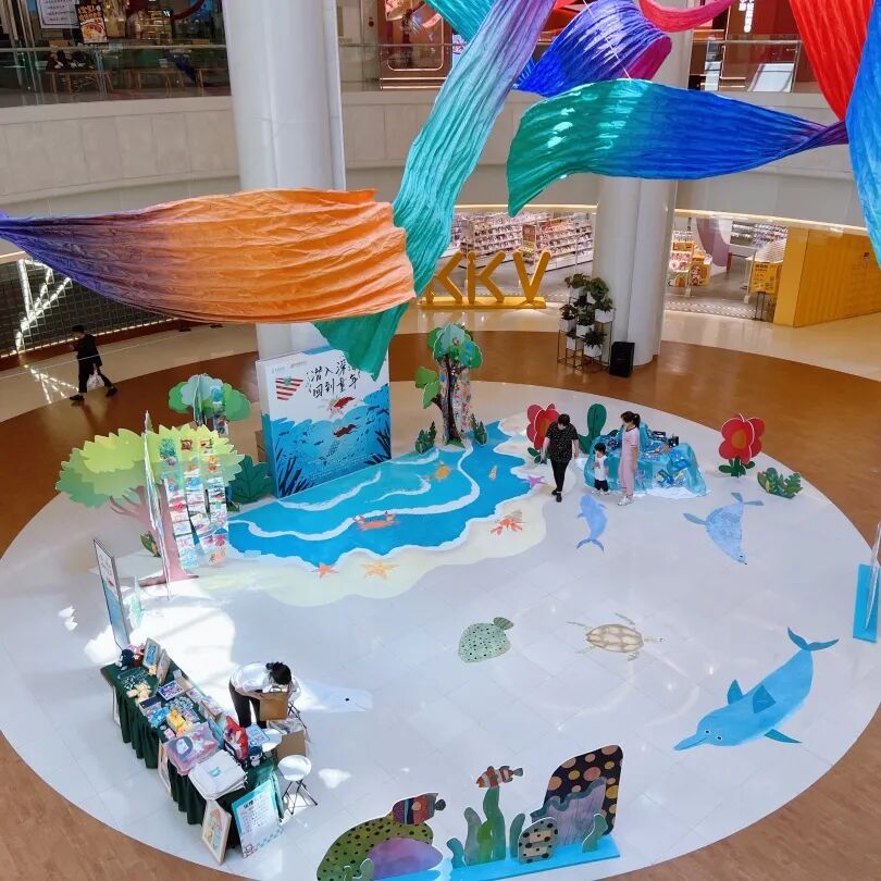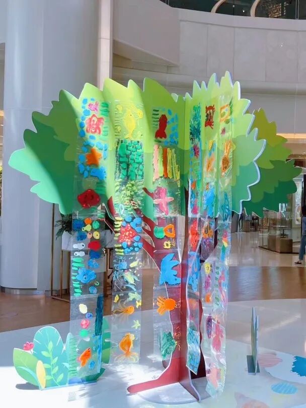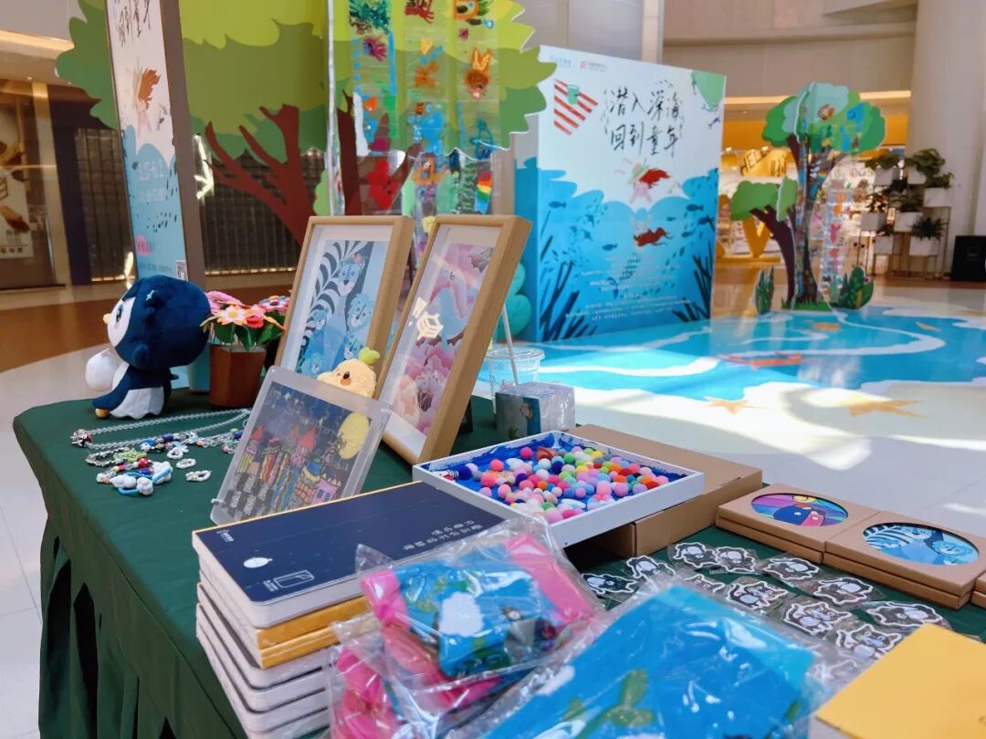一层中庭的活动现场,春晖博爱公益基金会精心构建了一个宛如梦境的深海世界,蓝色幕布上五彩斑斓的海洋生物仿佛在低语,诉说着那些遥远的海洋传说。一幅幅描绘着海底世界的画作尤为引人注目,春晖宝宝们用丰富的想象力和创造力带大家潜入了深海的怀抱,与海洋生物共舞。