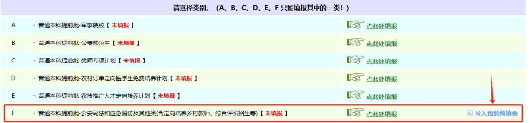 提前批本科分为不同类别,小王同学填报的中国人民公安大学属于“普通本科提前批-公安司法和应急消防及其他类(含定向培养乡村教师、综合评价招生等)”,因在志愿填报辅助系统中已经预填了志愿,点击对应项后的“导入我的预填表”: