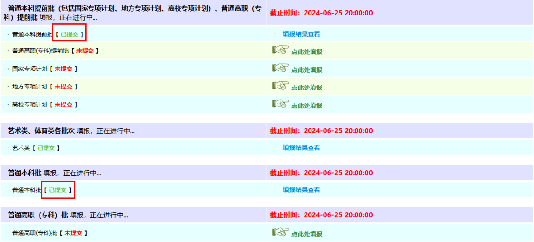 可以看到,普通本科提前批和普通本科批志愿已经填报完毕,如果还要填报其他志愿,只需重复上述操作即可。