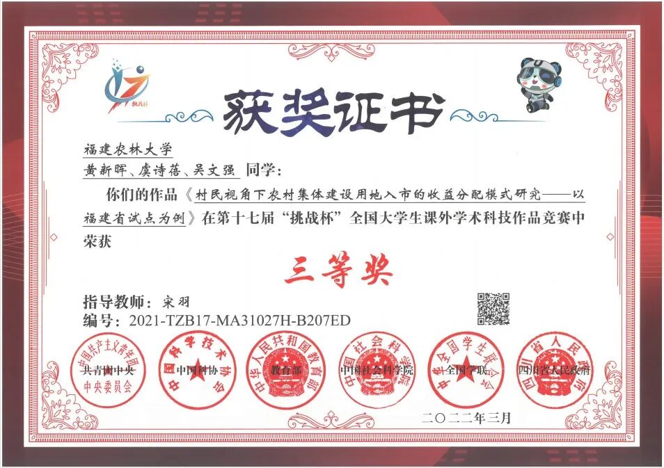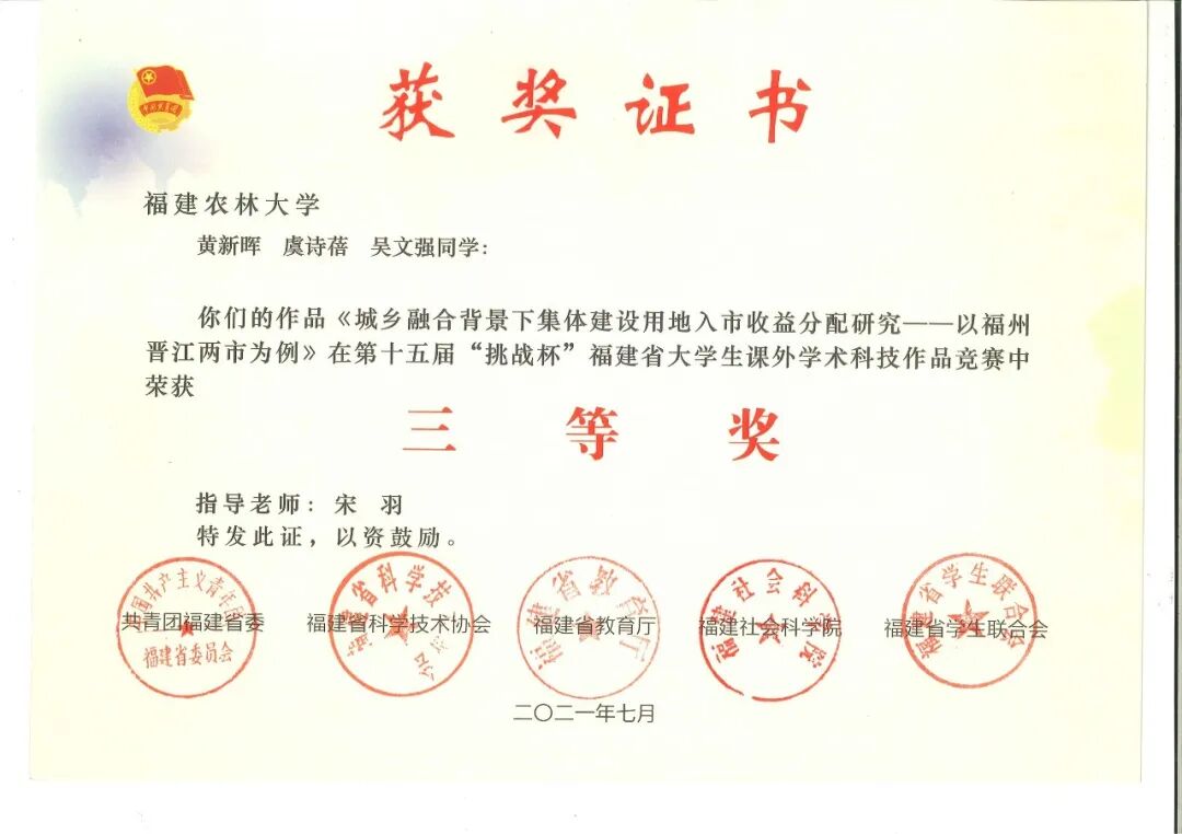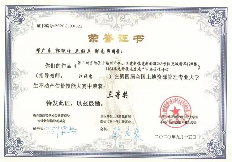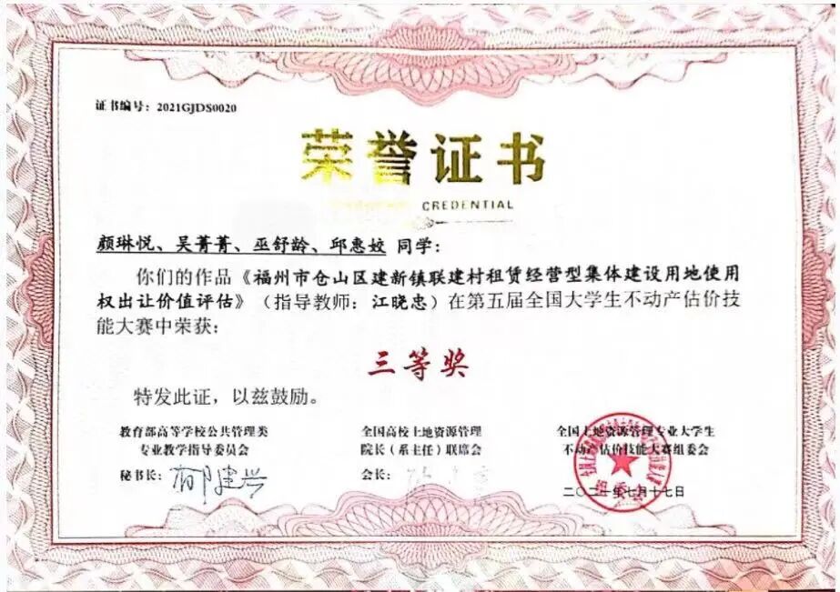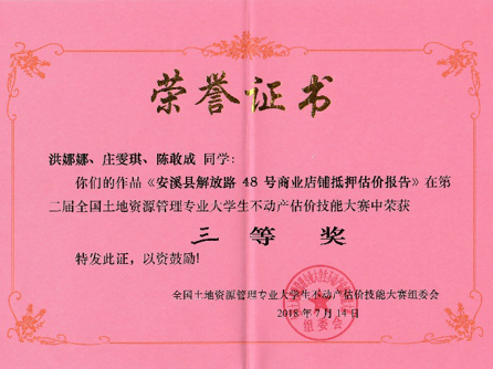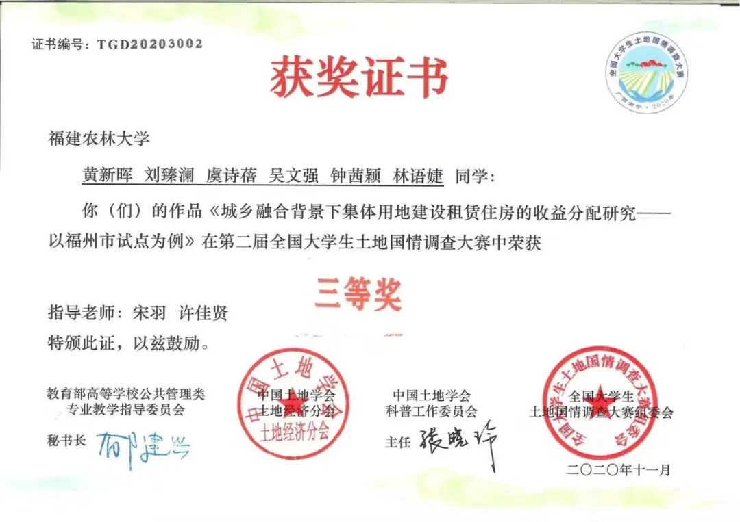 本专业实践性强,注重学生的动手能力的培养,社会实践内容十分丰富。有基于教学内容的专业技能实践,有结合导师课题开展的教学科研实践,有基于行业协会组织的专业竞赛社会实践,有基于社会企业的生产性实践,还有基于学校、学院组织的三下乡社会实践。先后获得第六届“北斗杯”全国青少年科技创新大赛国家级二等奖,第十四届“挑战杯”中航工业全国大学生课外学术科技作品竞赛国家级二等奖 ,第八届“认证杯”数学中国数学建模网络挑战赛国家级二等奖,全国土地资源管理专业第二届不动产估价技能大赛国家级三等奖,优秀组织奖;全国土地资源管理专业第三届不动产估价技能大赛国家级三等奖,第一届福建省青年创新创业大赛省级优秀奖,第十七届“挑战杯”全国大学生课外学术科技作品竞赛三等奖 ,第四届“国地杯”全国大学生土地国情调查大赛一等奖,第一届“创青春”中国青年碳中和创新创业额大赛学术组全国铜奖,第十五届“挑战杯”福建省大学生课外学术科技作品竞赛红色专项活动三等奖,第十五届“挑战杯”福建省大学生课外学术科技作品竞赛三等奖,第二届全国大学生土地国情调查大赛三等奖。