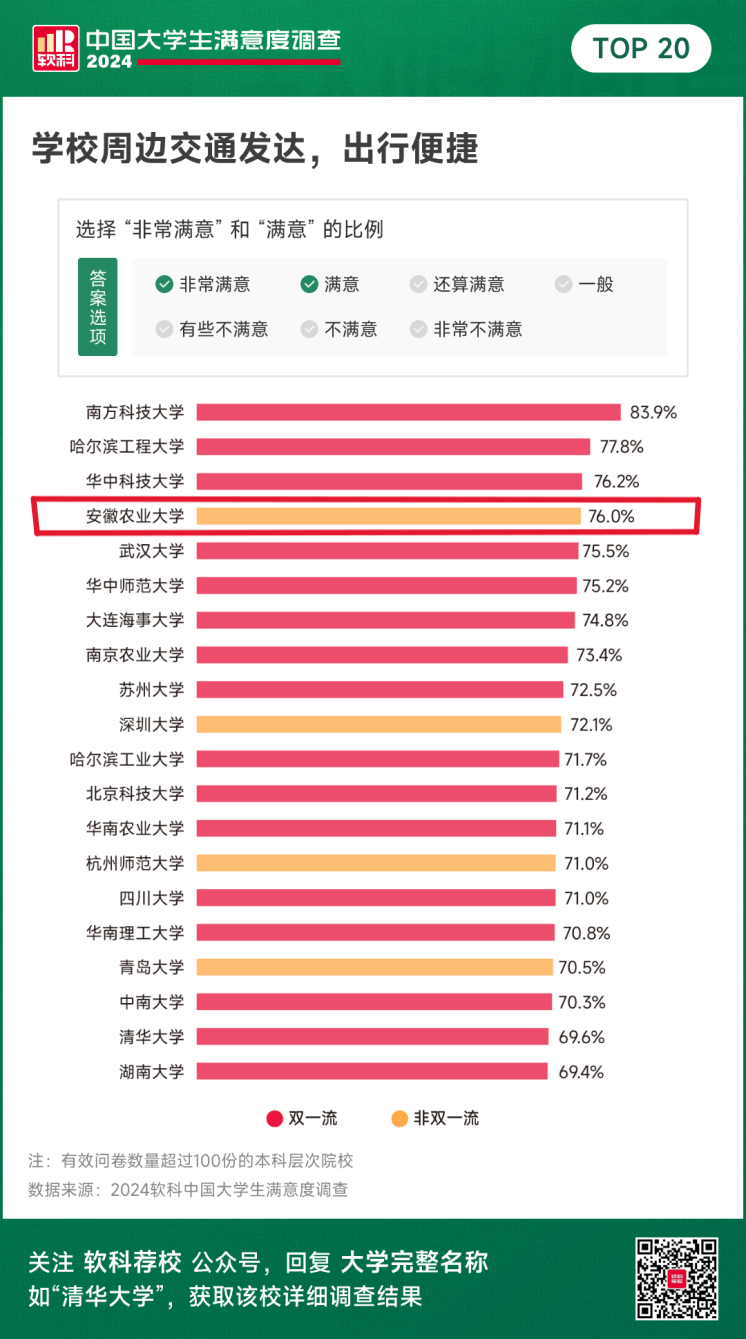地理位置极佳,校园环境优美。我校是全国唯一一所坐落于省会城市一环内的农业类院校,地铁直达校门,毗邻合肥市长江西路两大现代化商圈,学校环境优美,是广大学子治学和成才的理想园地。在软科发布2024中国大学生满意度调查结果中,在“学校周边交通发达出行便捷”方面,学校排名全国院校第四。