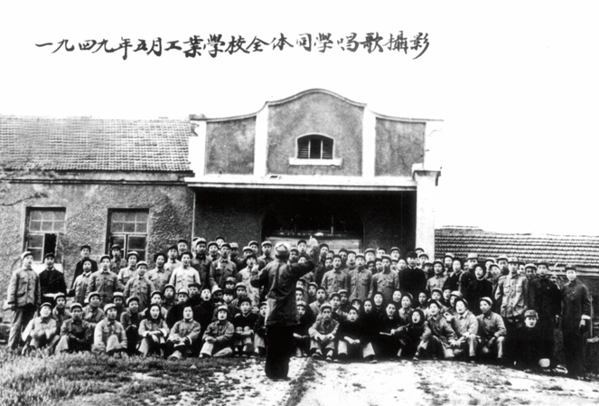 1949年5月,华东财办工矿部工业干部学校全体同学合唱,前排左九为宋健院士