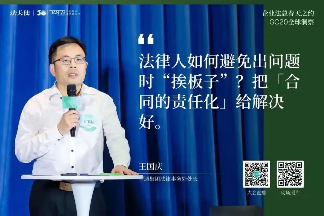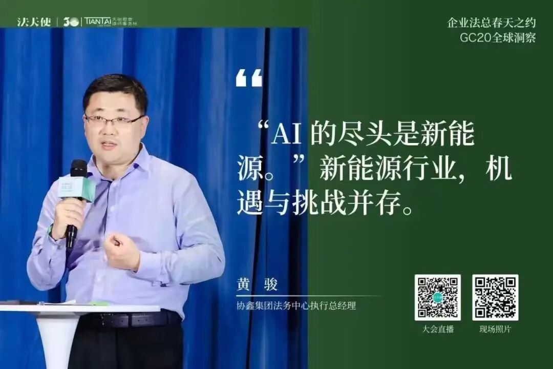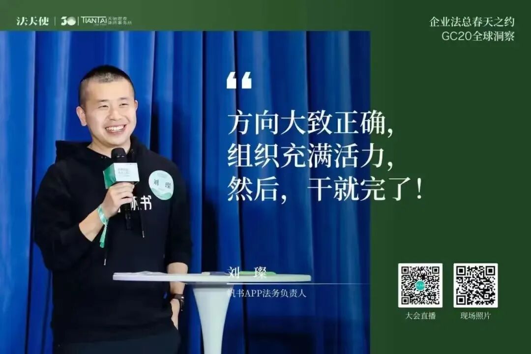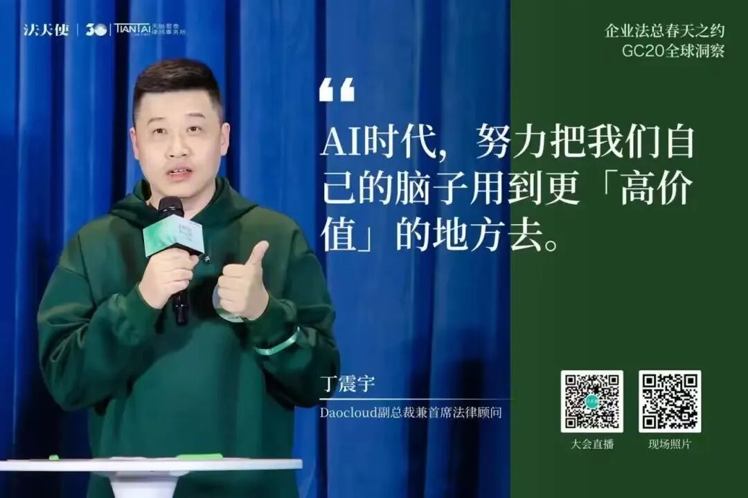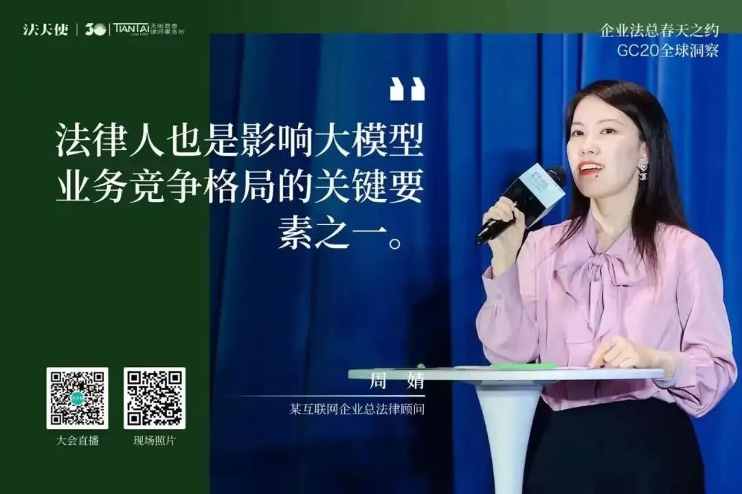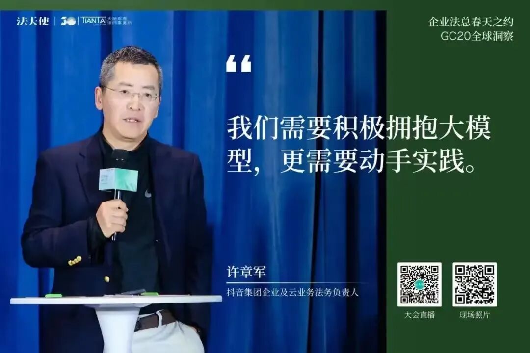 张慧子详细介绍了Microsoft Copilot如何通过人工智能技术改变工作方式,提高效率。她展示了Copilot在会议记录、数据分析、内容创建、邮件处理等方面的应用,强调了在处理大量信息和日常工作任务时,它如何帮助用户节省时间。同时还提到了Copilot的个性化功能,即能够理解用户的业务背景和邮件上下文,提供定制化的回复和内容创作。此外,她还讨论了用户如何通过学习和适应来掌握Copilot的使用,从而实现显著的时间节省,提升工作效率。20名GC以3-5人小组的形式,围绕「AI与我最重要的那件事」展开交流讨论。GC们讨论了个人与企业在AI时代的定位、AI的道德和伦理限制、在AI技术上的投资是否能够带来预期的商业价值和运营效率、如何实现人机有效协作、AI技术如何尽快商业化落地、教育体系如何适应AI时代的挑战等核心议题。这些讨论将帮助GC们更好地理解AI技术在企业运营中的作用,以及如何在保障人类价值和社会伦理的同时,最大化AI的商业潜力。4月20日下午,百位法总相约上海,参加「企业法总春天之约」的最后一站——GC20 全球洞察大会。2场主题演讲,4场圆桌洞察对话,1场报告发布仪式,1场世界咖啡。天驰君泰、蓝旗律政、新则、法蝉、威科先行、海蜂法务、律商联讯、北大法宝、法律先生与法天使联合同步直播此次会议,15577位朋友线上共同参与本次聚会。常金光强调了企业法务兼具企业家精神与法律人思维的重要性,提出了“GC20全球洞察”活动的双重意义,即汇聚顶尖法务负责人分享洞见,并促进企业法务间的交流与合作。他介绍了活动当天的安排,并希望通过深入讨论和真诚交流,为法律同行和行业伙伴提供宝贵的行业洞察。姜丽丽代表北京仲裁委员会表达了对“企业法总春天之约”活动的全力支持,并以幽默的方式表达了将活动带到北京的愿望。她强调了法律人在推动企业和社会进步中的重要性,提出了对未来法律职业平台建设的合作建议,并对未来的长期合作与发展表达了乐观的期待和美好祝愿。- 火山引擎大模型算法负责人 王科:《大模型技术的前沿趋势观察》
