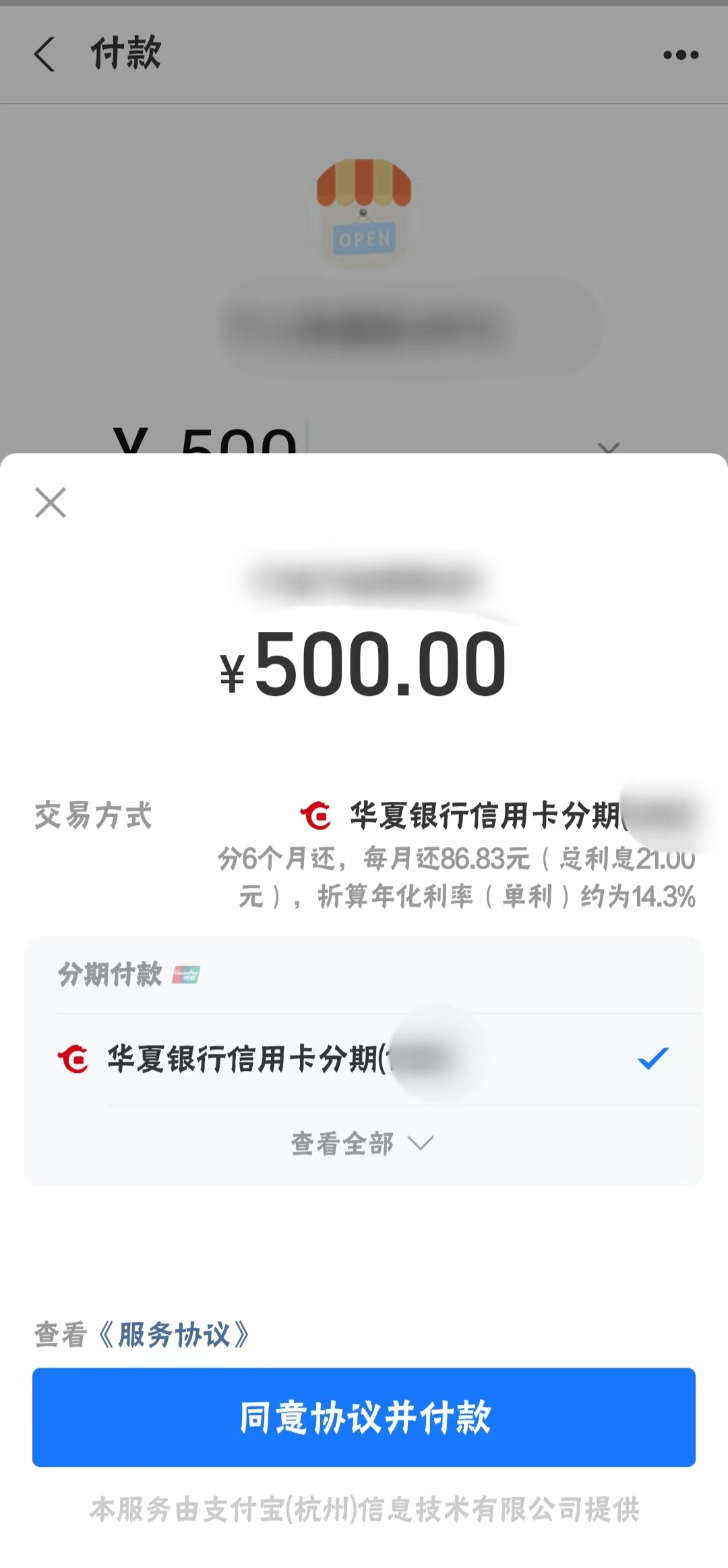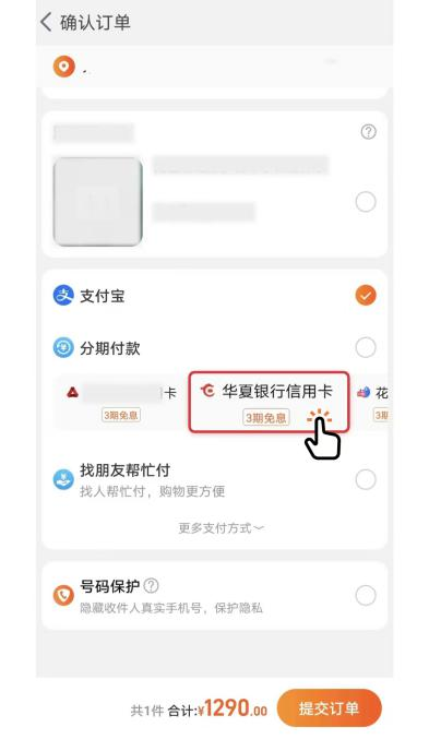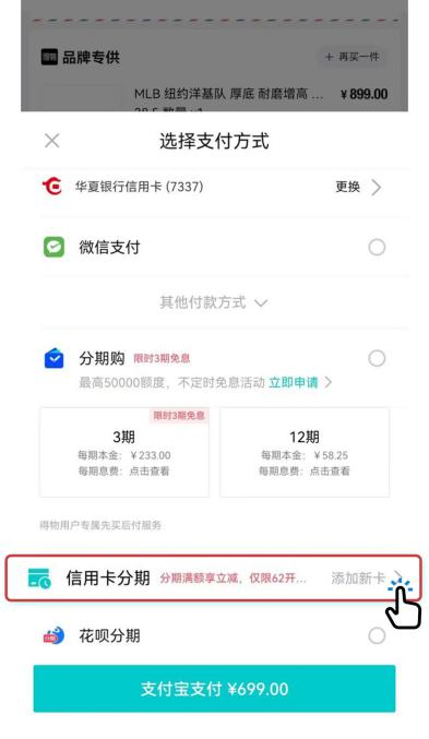 华夏银行银联信用卡持卡人购买指定商品单笔/合并通过支付宝付款超过500元(含)并成功办理分期,即可享受最高24期免息分期,无名额限制。