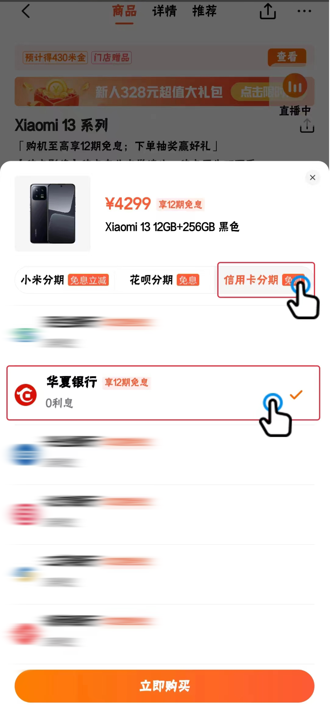 华夏信用卡持卡人通过小米商城、小米有品以及线下门店购买指定商品单笔/合并付款超过10元(含)并成功申请3、6、12或24期分期,即可分期付款,更有海量商品享受免息分期。