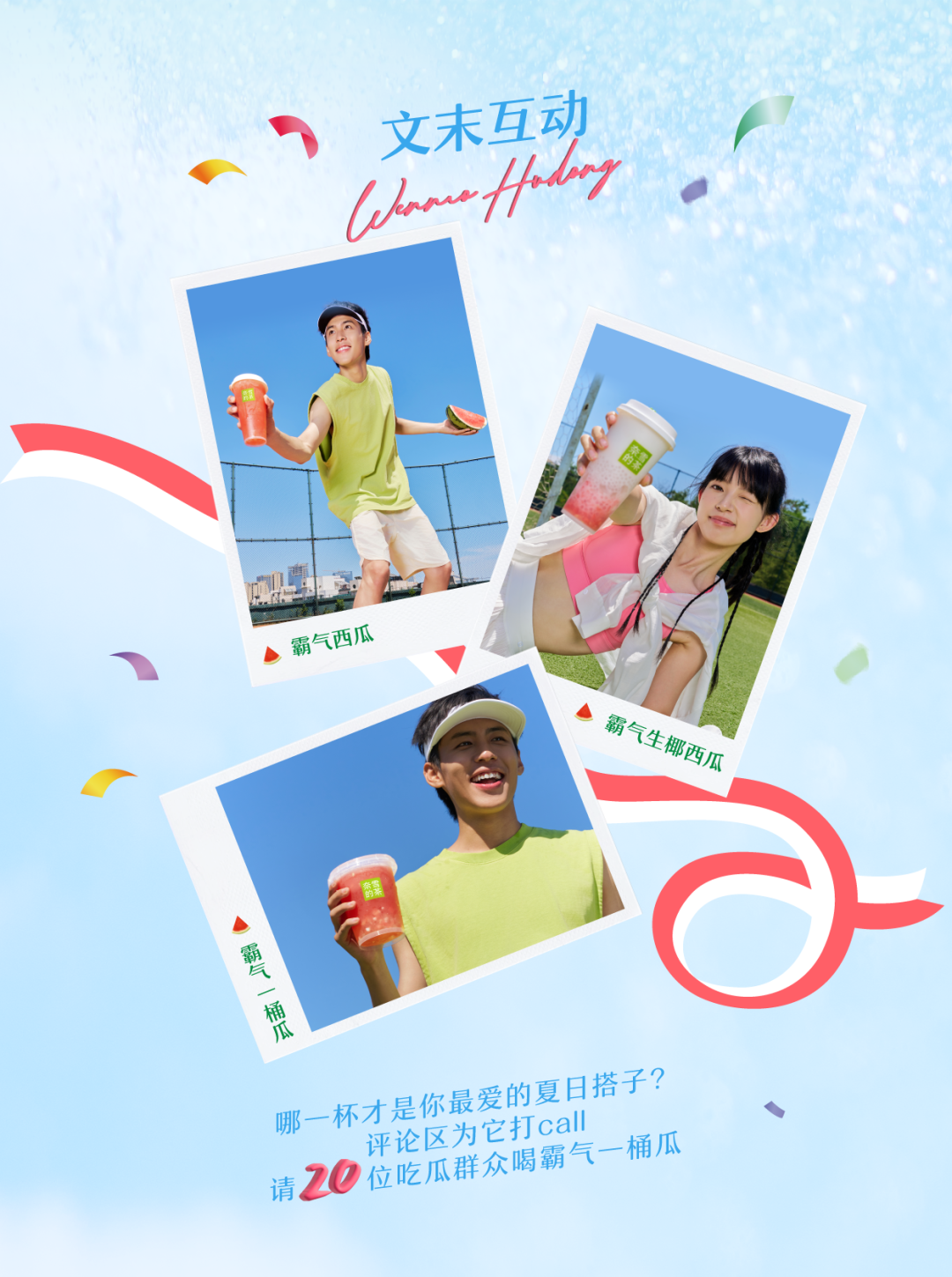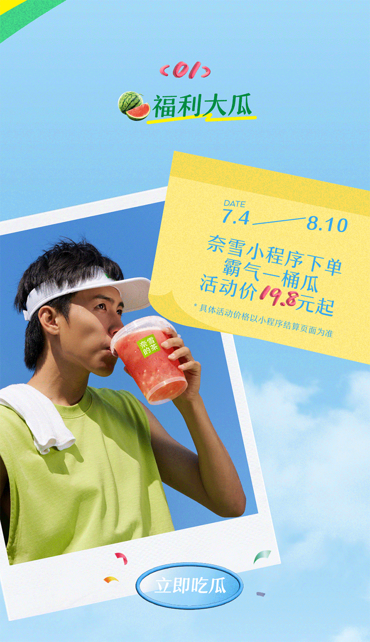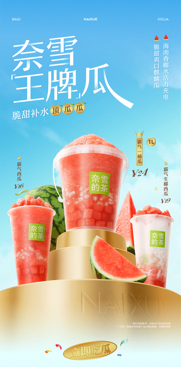 天气好热 感觉要融化了 暴汗好渴啊~ 霸气一桶瓜 升级回归 前调:沁甜西瓜冰爽降温 中调:清冽香椰“电力”十足 后调:Q嫩椰冻弹走炎热 水嫩甜心麒麟瓜 完熟好瓜,个头大如球 咔嚓一声蹦开 炸出清香瓜味和红润瓜肉 甜滋滋 水当当 脆爽甘香 在舌尖卷起甜蜜风暴 击退高温热浪 醇净“满电”香椰水 来自海南的香椰水 汁水清澈透亮 香气清冽如风 口感清甜爽口 西瓜mix香椰水 搅打成冰沙 凉爽up!甜感up!大口咕噜!补水“充电”!1桶热量≈249kcal *热量估算数据,霸气一桶瓜为1000ml、推荐冰量、不另外加糖选项下的标准出品;QQ弹弹椰青椰肉冻 香滑弹润椰冻裹椰肉粒 双倍嚼劲,在口腔里快乐跳跃 duang duang弹走炎热 椰香翻涌,口感翻倍 香椰水与生椰乳融合,香气加倍 好似在椰子海浪里荡漾 西瓜粒、椰青椰肉冻、西米轮番登场 共同开启盛夏聚会 霸气生椰西瓜 1杯热量≈159kcal 前调:椰香如清风拂面 中调:西瓜粒脆甜满口 后调:椰冻西米嚼劲足 *热量估算数据,霸气生椰西瓜为中杯、推荐冰量、不另外加糖选项下的标准出品;脆甜冰爽 果肉多多 霸气西瓜 嚼得到的多重果肉 一扫夏日暑气 1杯热量≈112kcal *热量估算数据,霸气西瓜为中杯、推荐冰量、不另外加糖选项下的标准出品;霸气西瓜系列 夏天喝西瓜 补水好喝笑哈哈 ①福利大瓜 7/4 - 8/10 奈雪小程序下单霸气一桶瓜 活动价19.8元起 *具体活动价格以小程序结算页面为准 ②新品第二件半价 7/3-7/7 邀请好友领券,享新品第二件半价 *优惠券不与其他活动同享,以实际结算页面为准 哪一杯才是你最爱的夏日搭子?评论区为它打call 请20位吃瓜群众喝霸气一桶瓜
