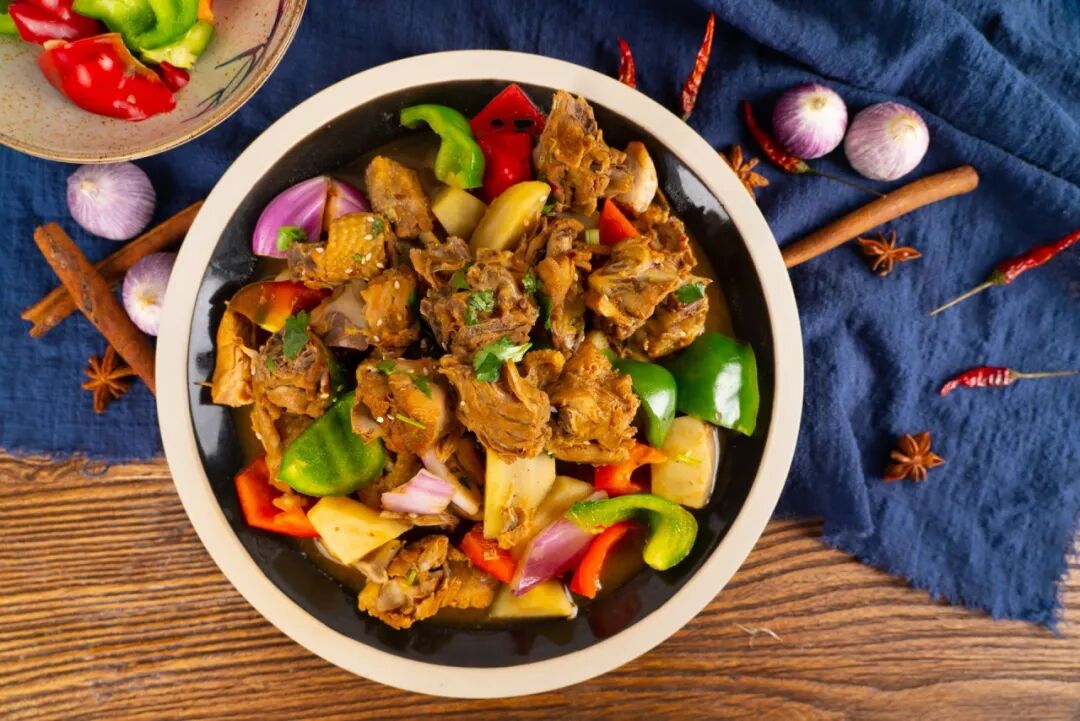 新疆大盘鸡以其独特的魅力征服了每一位食客。鲜嫩的鸡肉,沐浴在香辣的汤汁中,搭配软糯的土豆和火红的辣椒。咬上一口,香辣的滋味瞬间在舌尖绽放,醇厚而又不失细腻,令人陶醉。