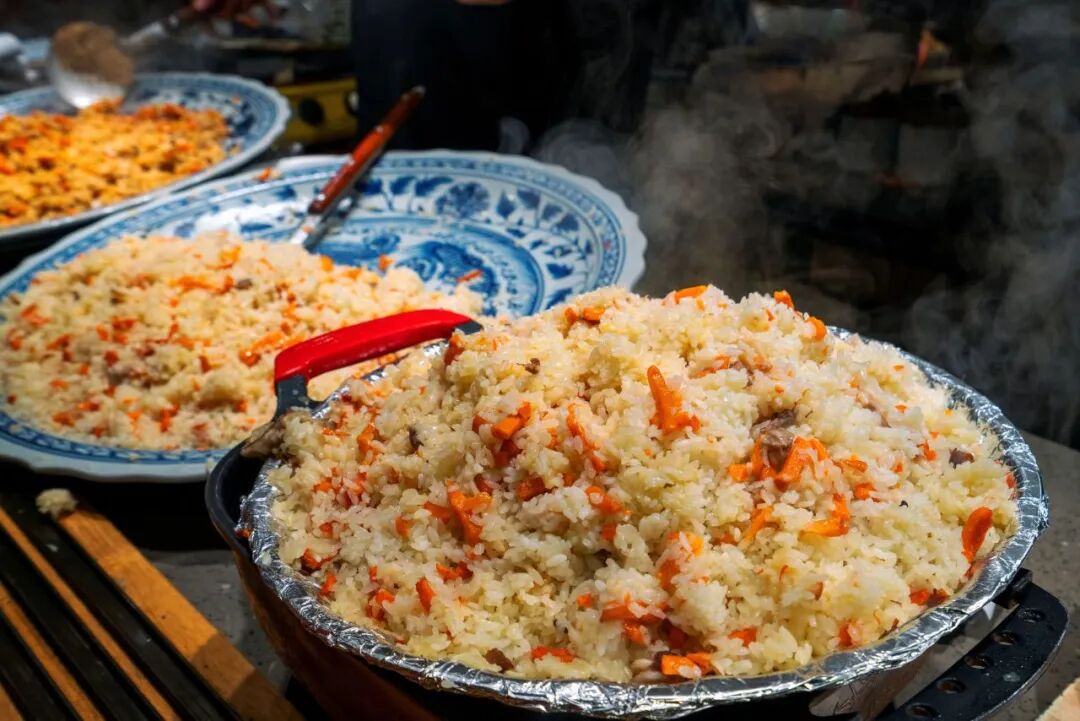 手抓饭的米粒色泽金黄,羊排香气扑鼻。米粒吸满了羊肉的醇厚与香料的馥郁,幸福感瞬间充盈口腔。